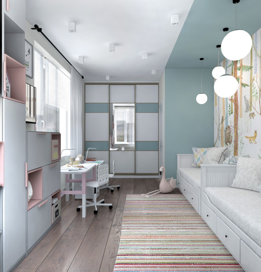 Интерьер узкой детской комнаты для двоих разнополых детей