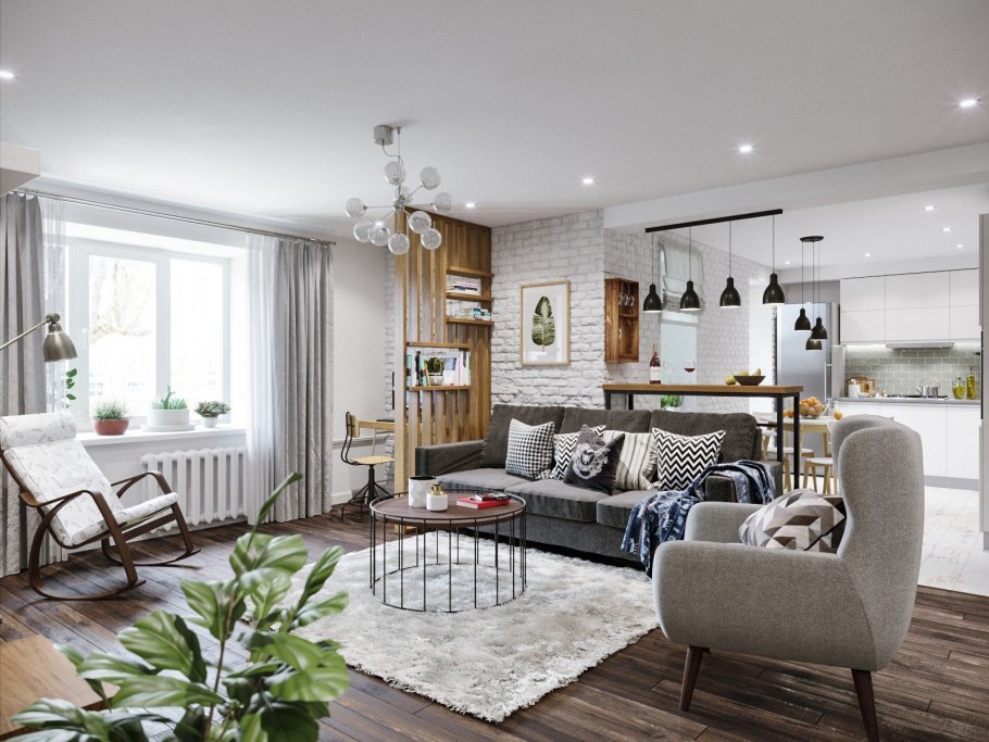 Гостиная в стиле сканди лофт в интерьере (82 фото)