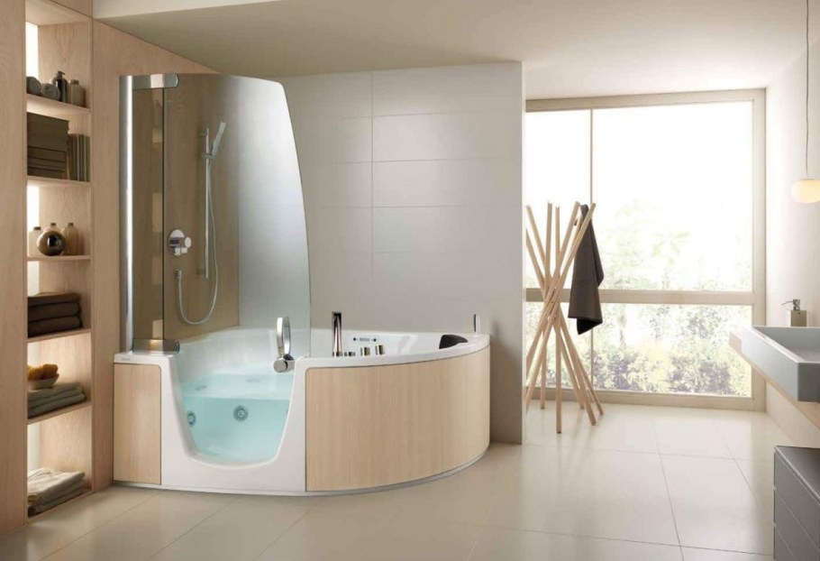 Интерьер ванной комнаты с угловой ванной