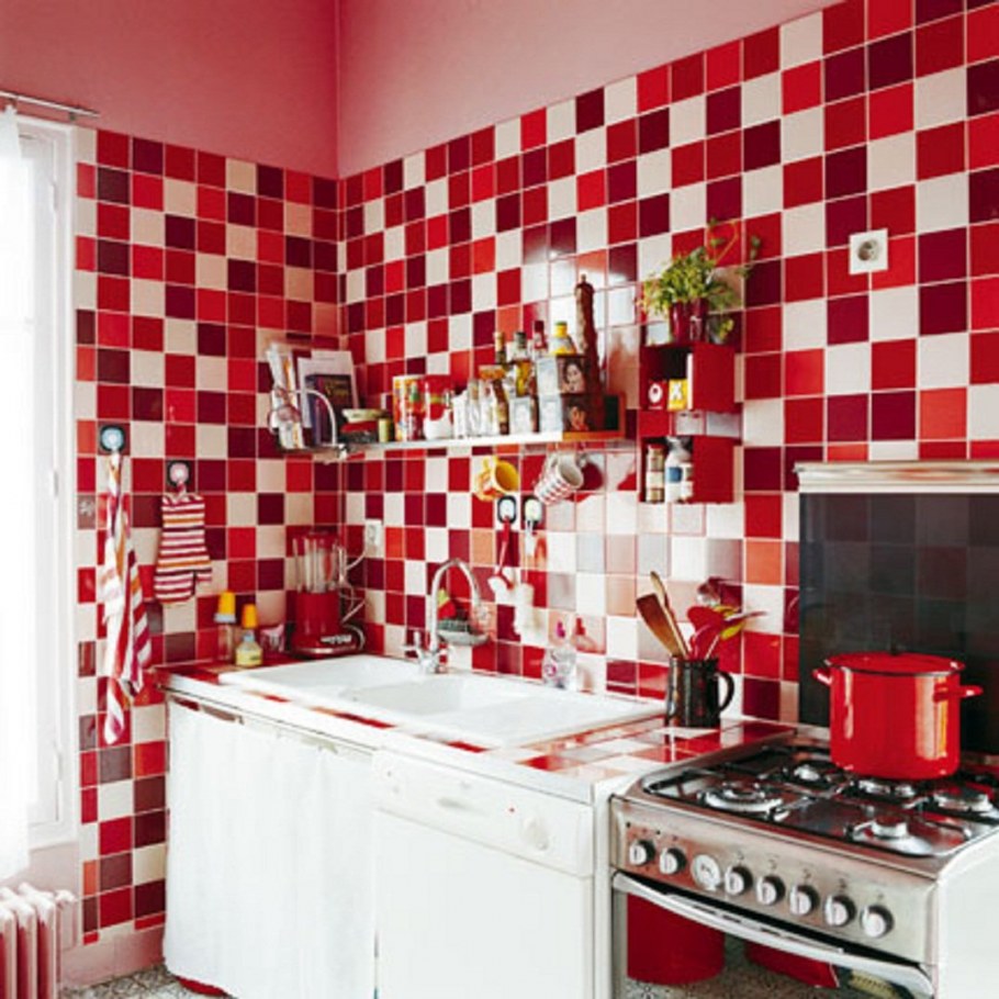 Красно белая плитка на кухне