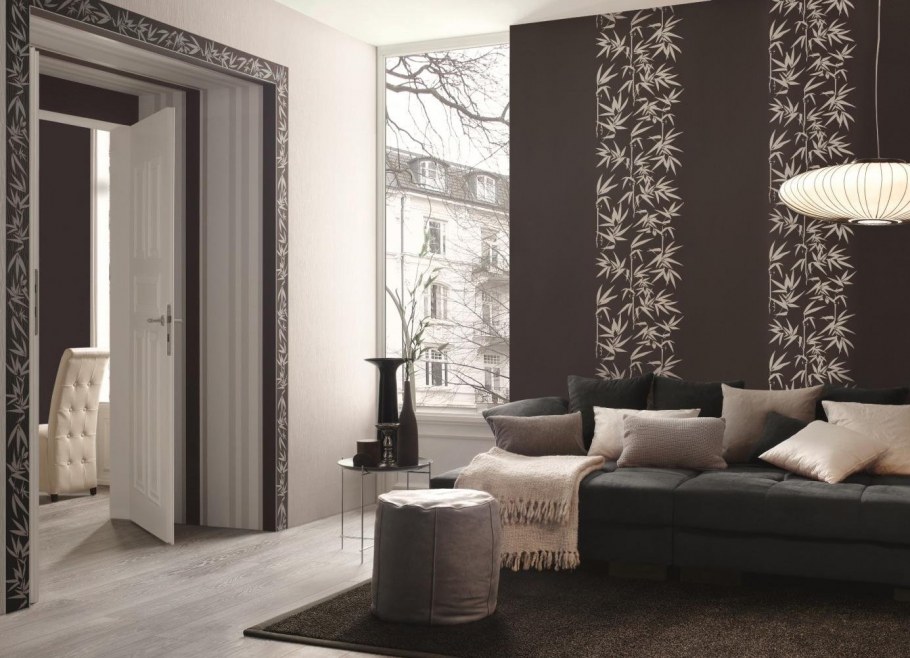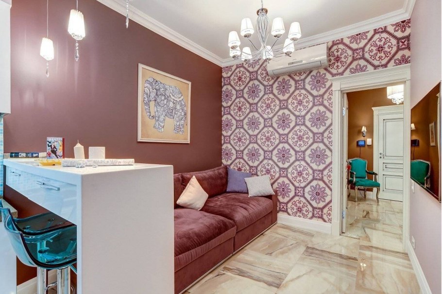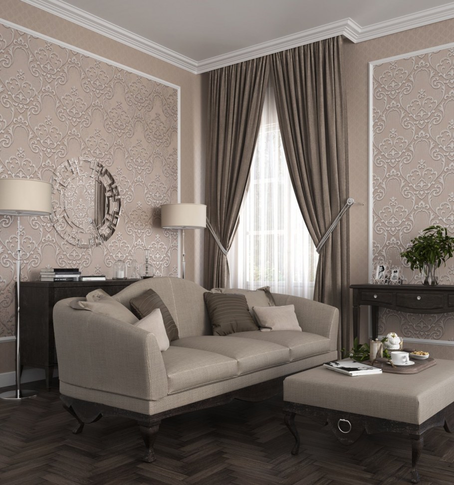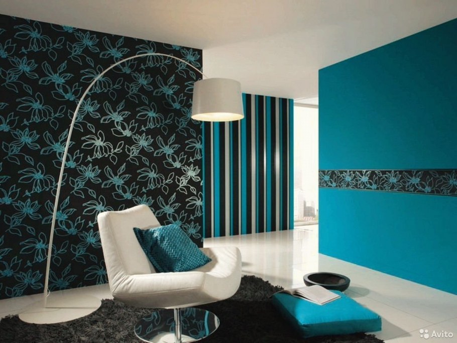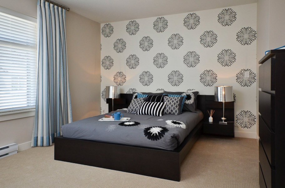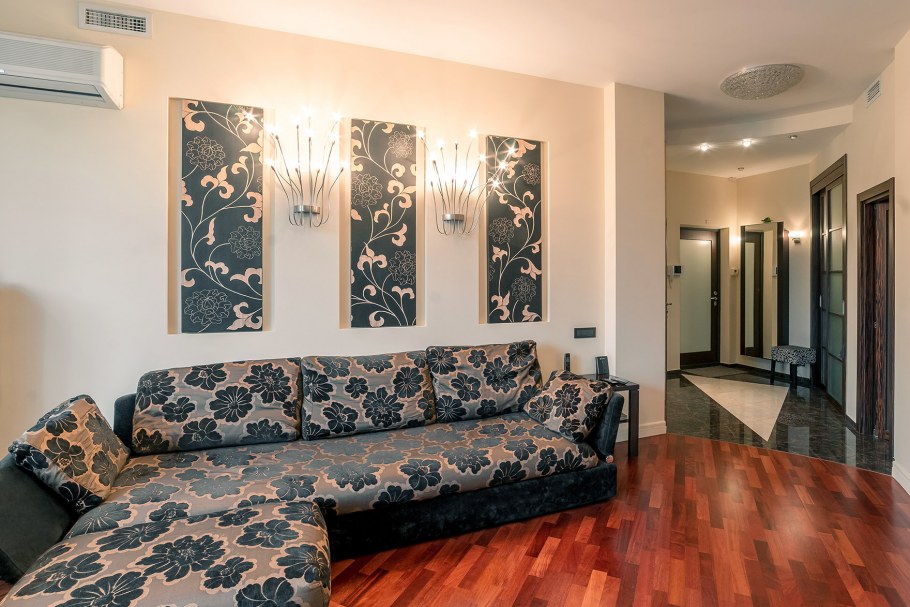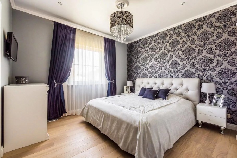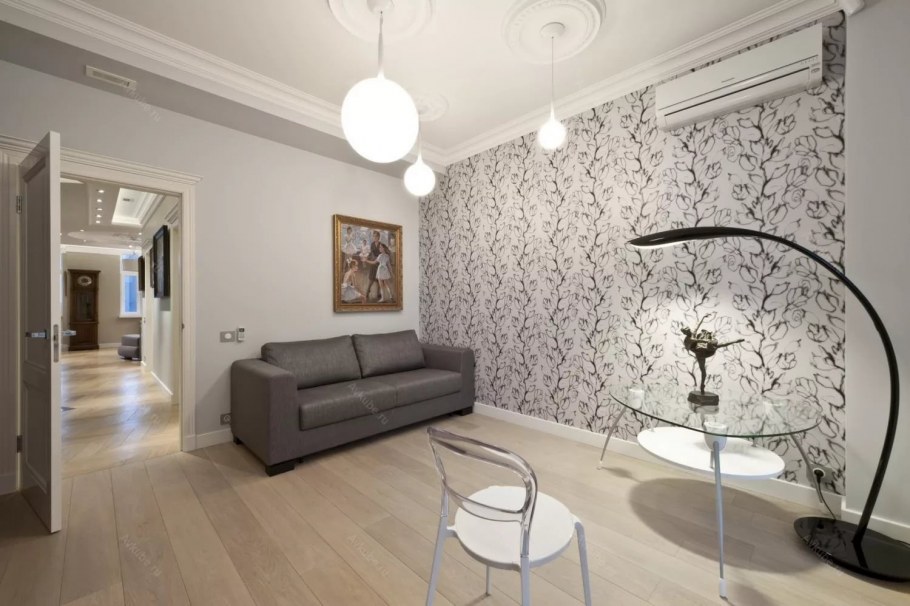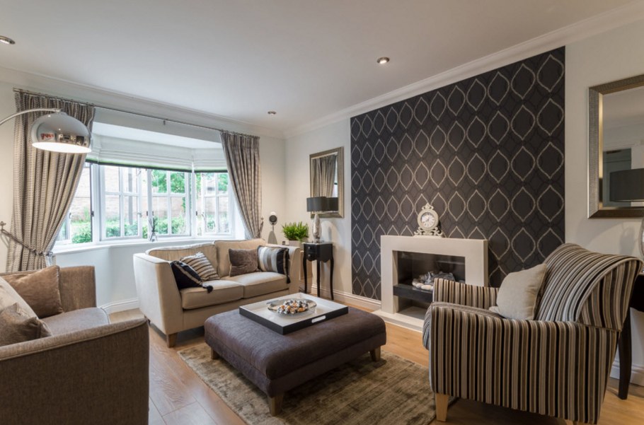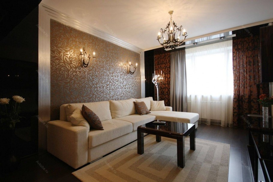 Гостиная с 2 окнами на одной стене с акцентной стеной за диваном