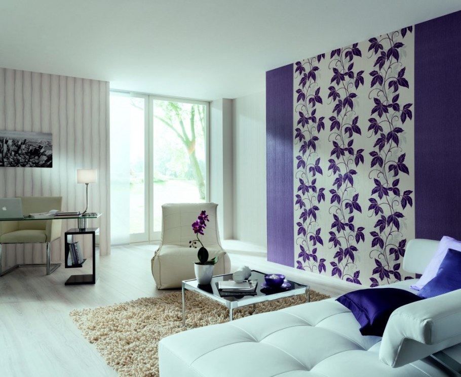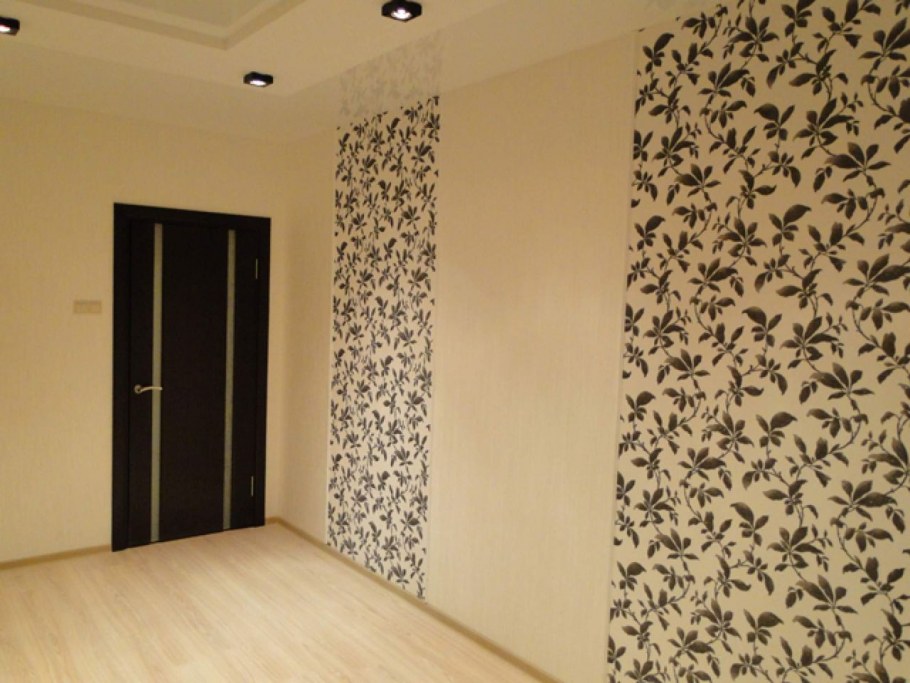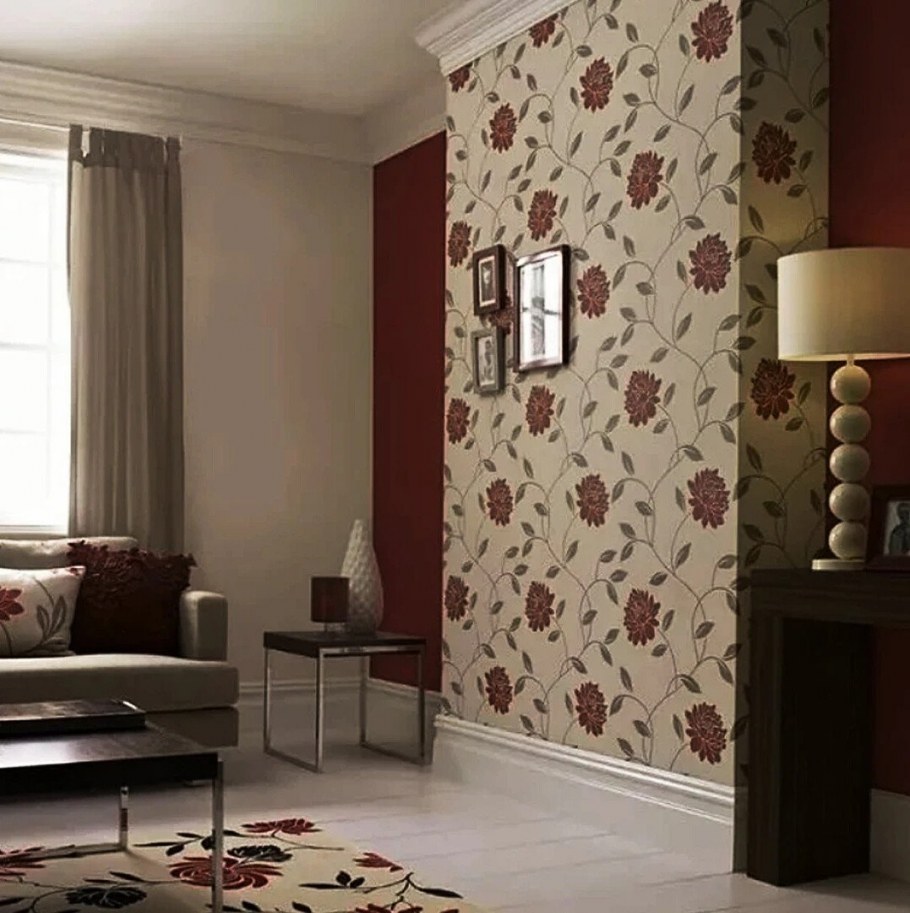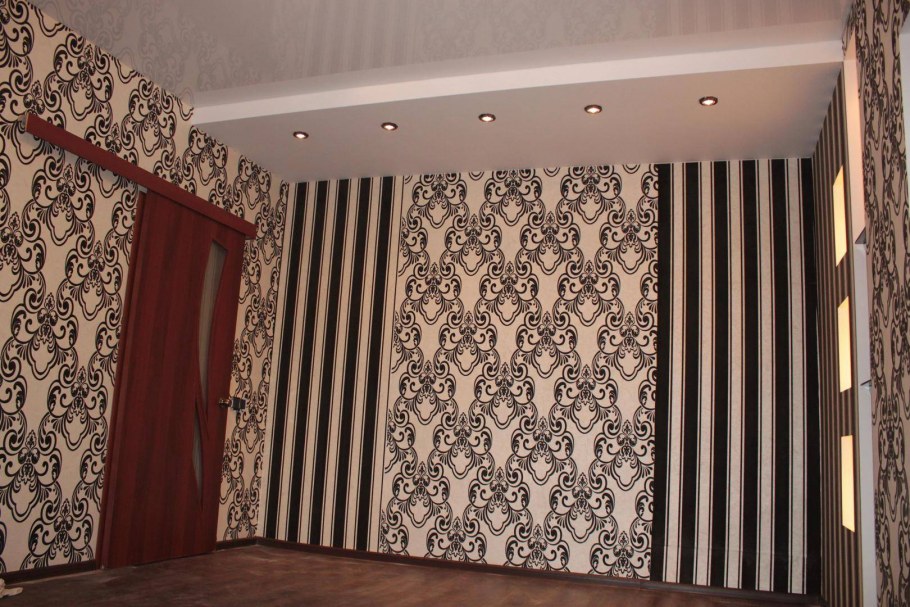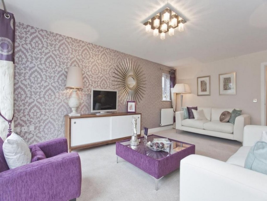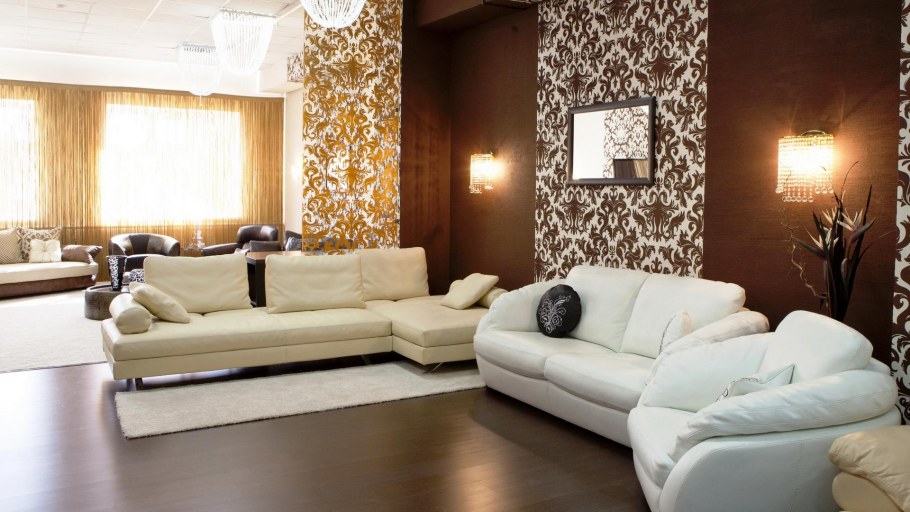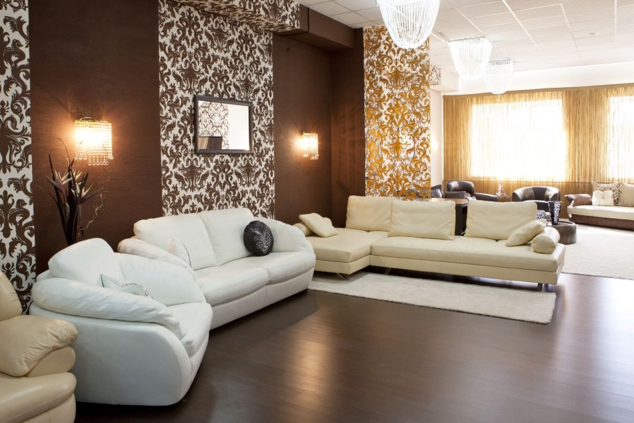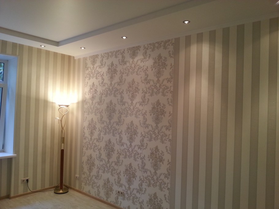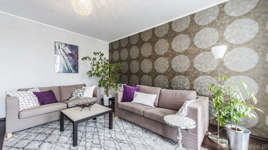 Гостиная с 2 окнами на одной стене с акцентной стеной за диваном