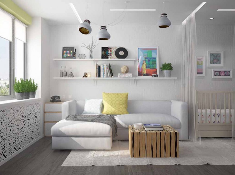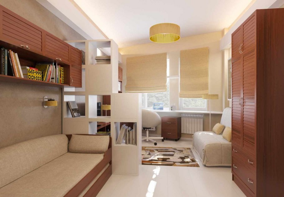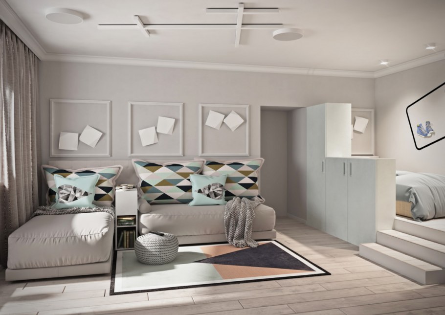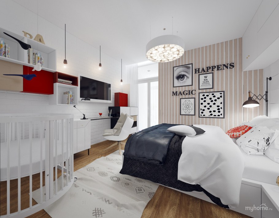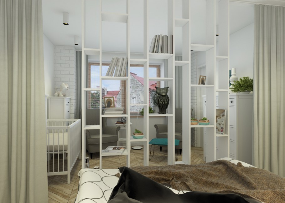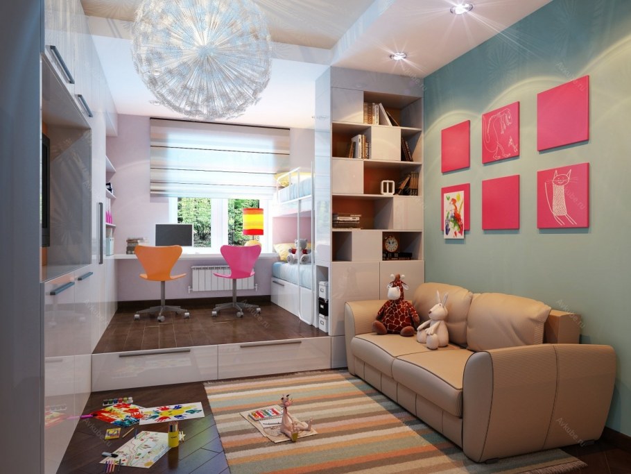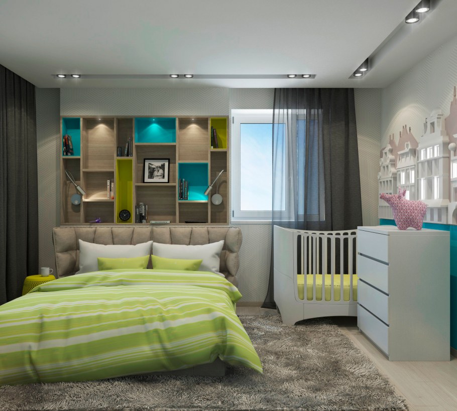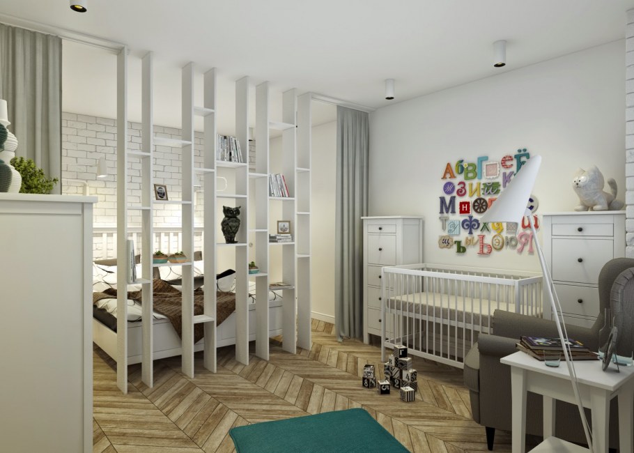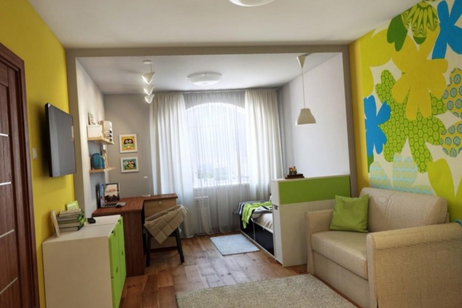 Зонирование комнаты с балконом для семьи с 2 детьми