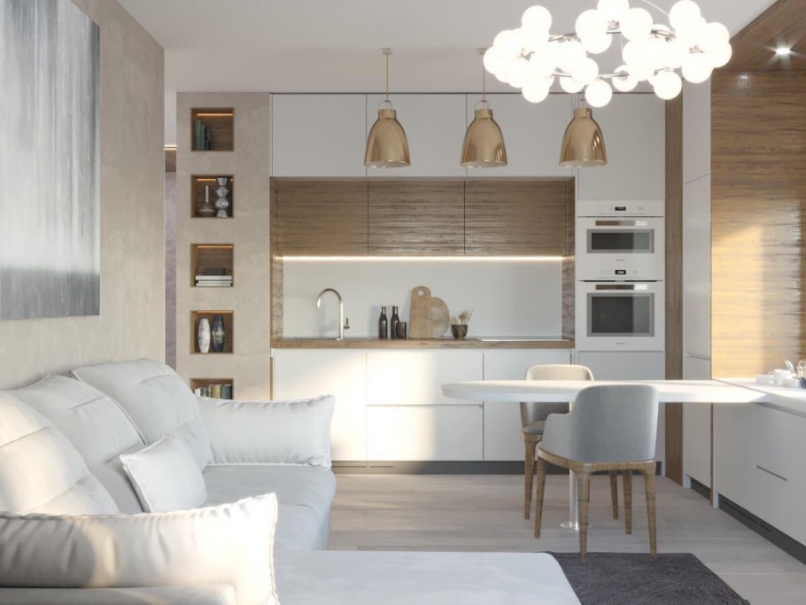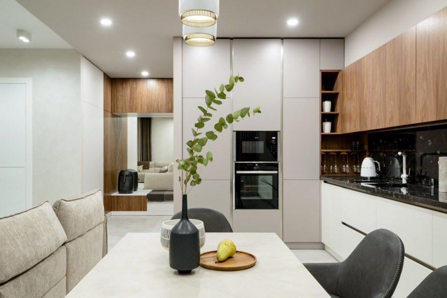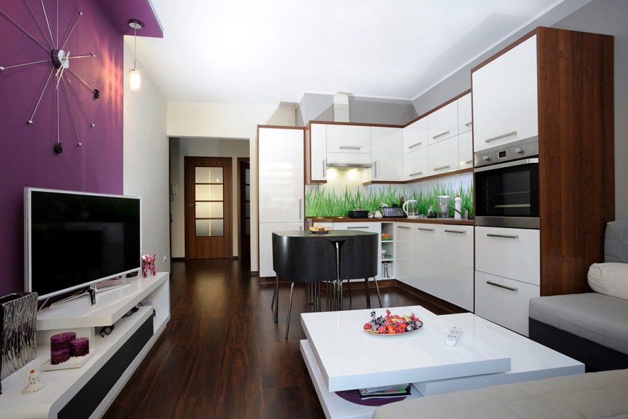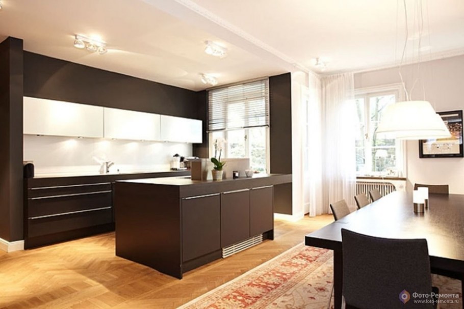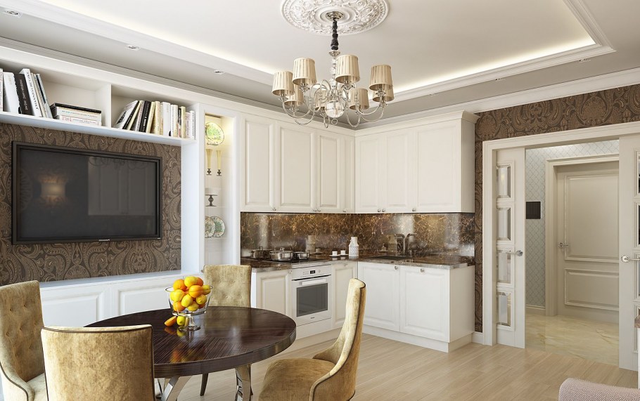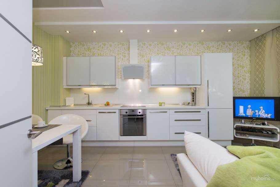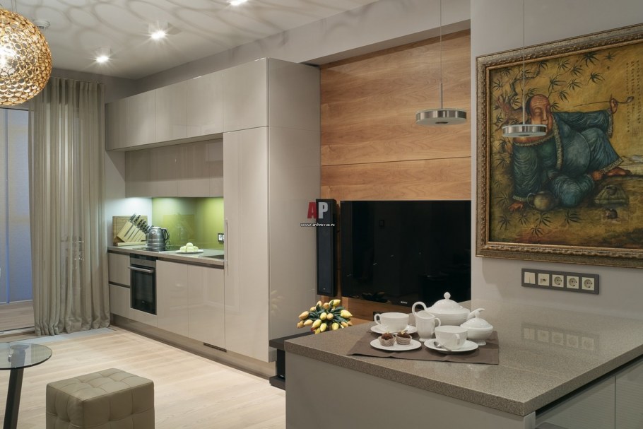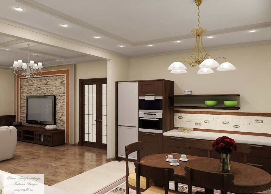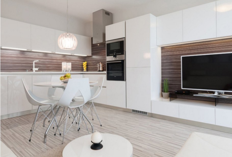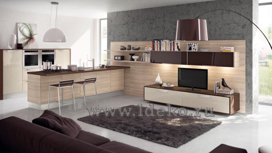 Гостиные с кухонным гарнитуром в интерьере (83 фото)