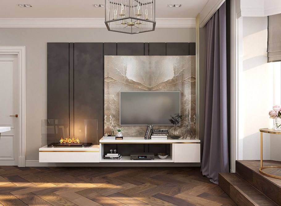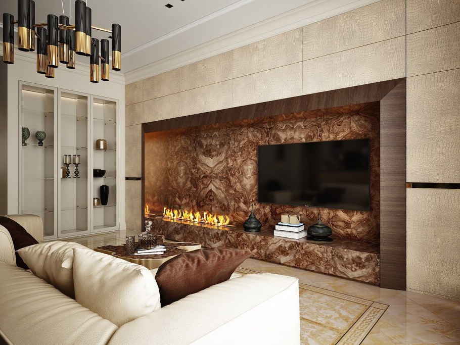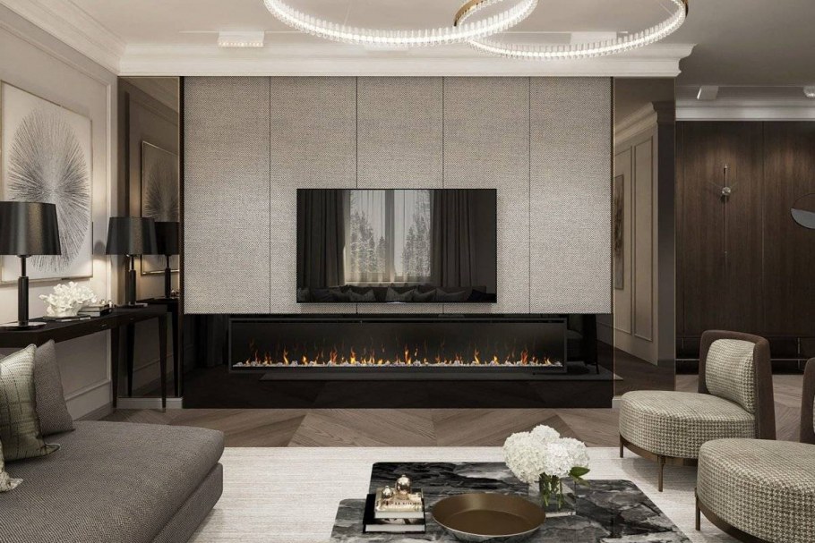 Камин в стене под телевизором