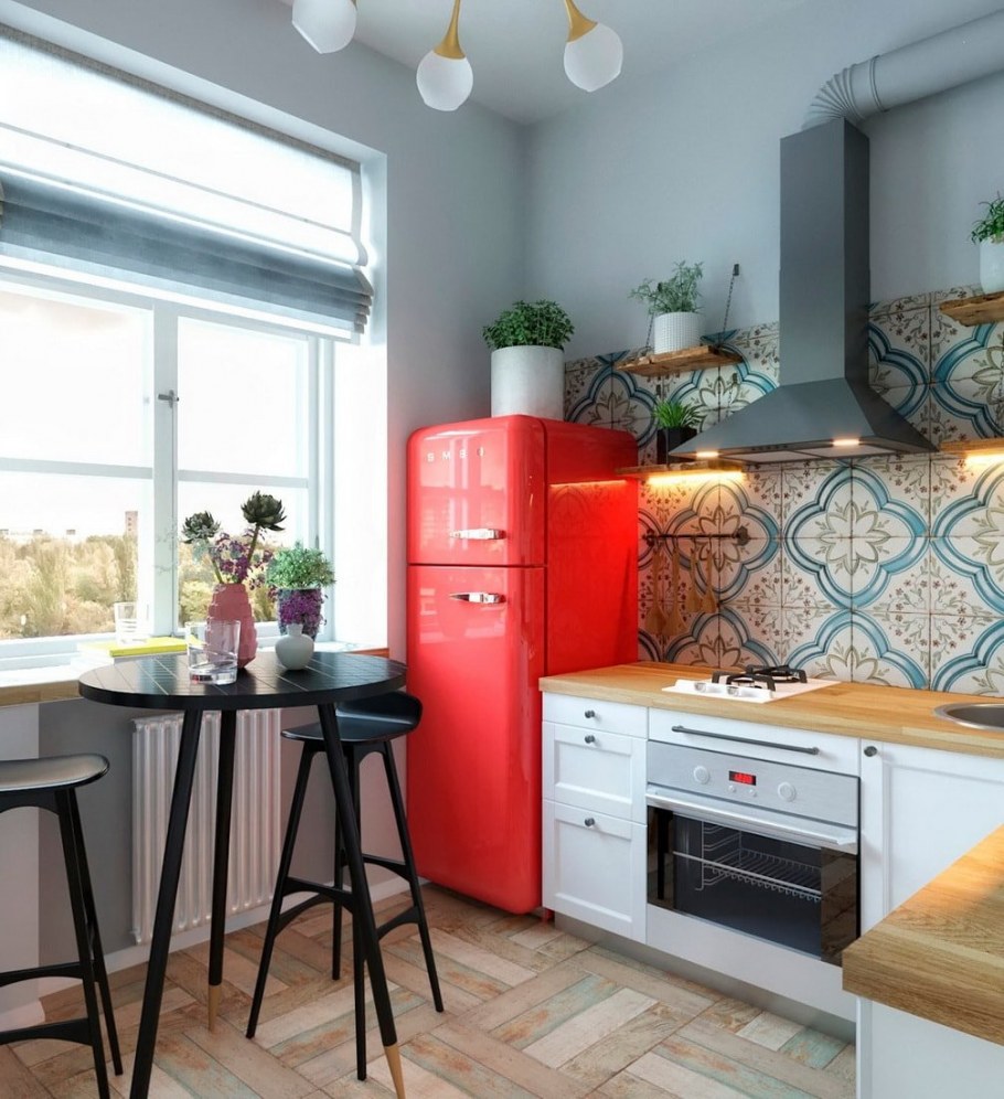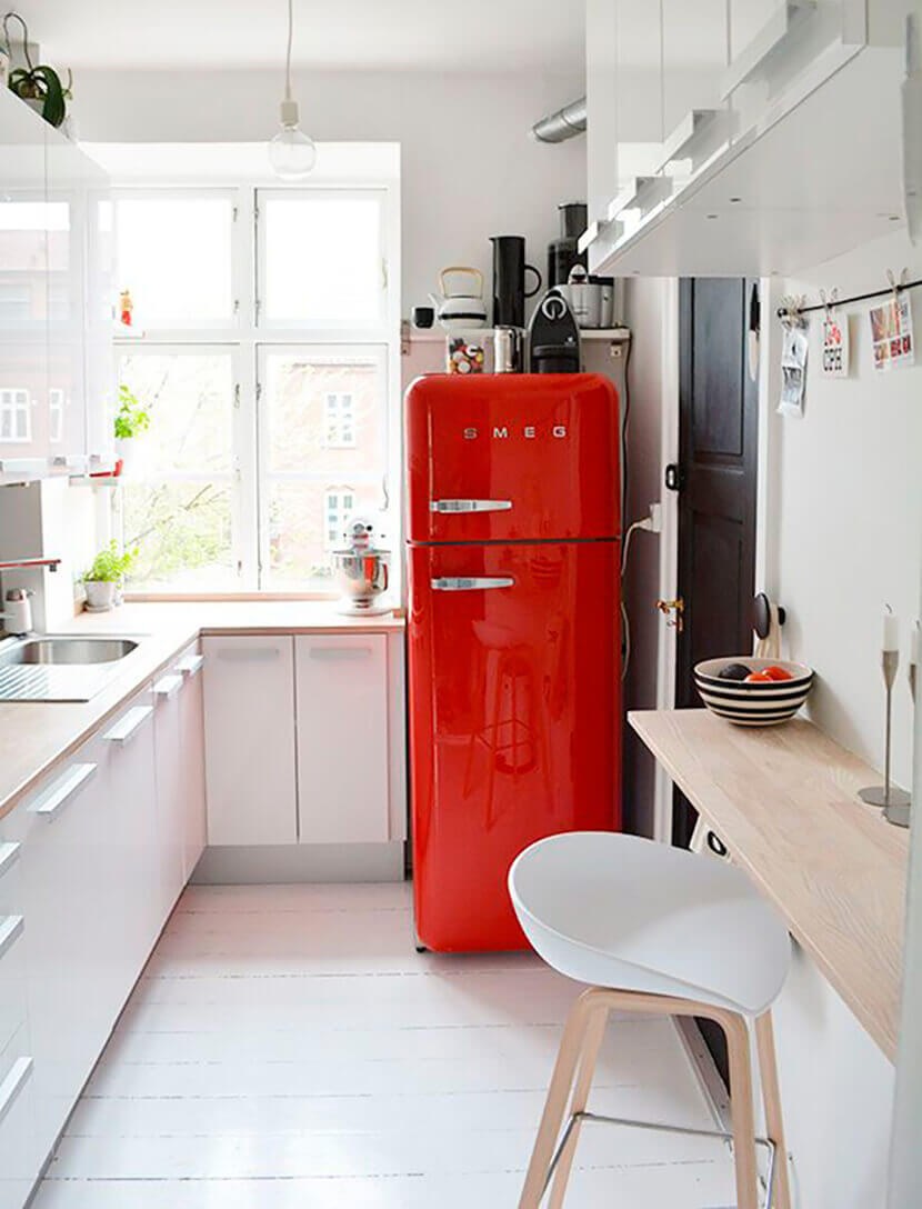 Красный холодильник в маленькой кухне