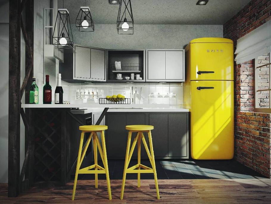 Кухня с желтым холодильником