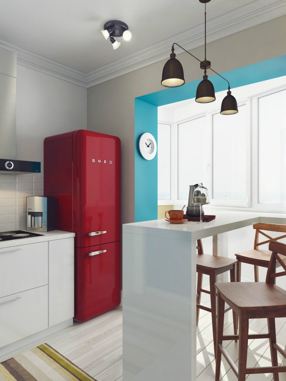 Холодильник Смег в маленькой кухне интерьер