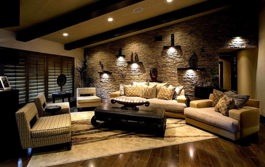 Каменная стена в интерьере гостиной (81 фото)