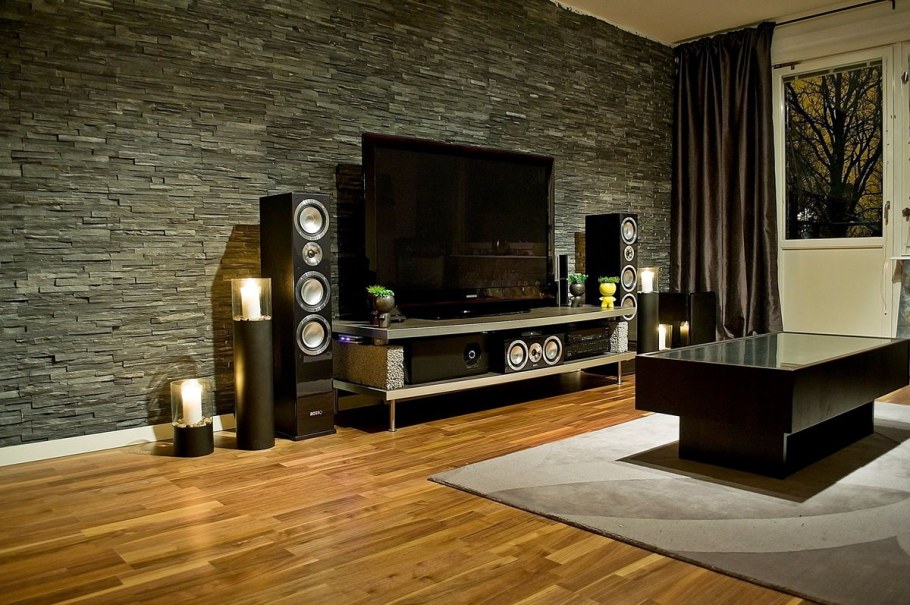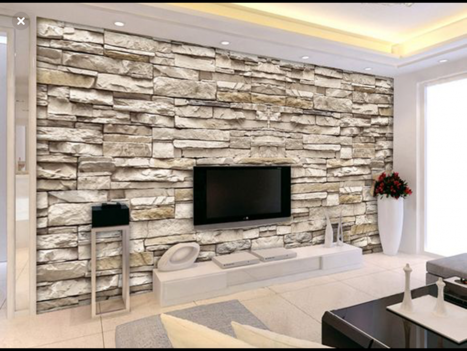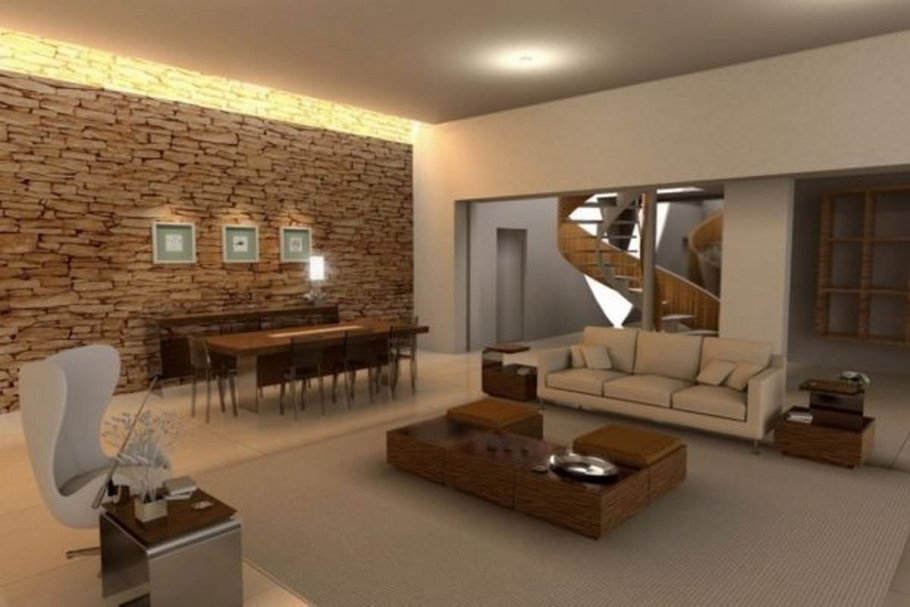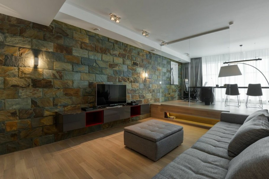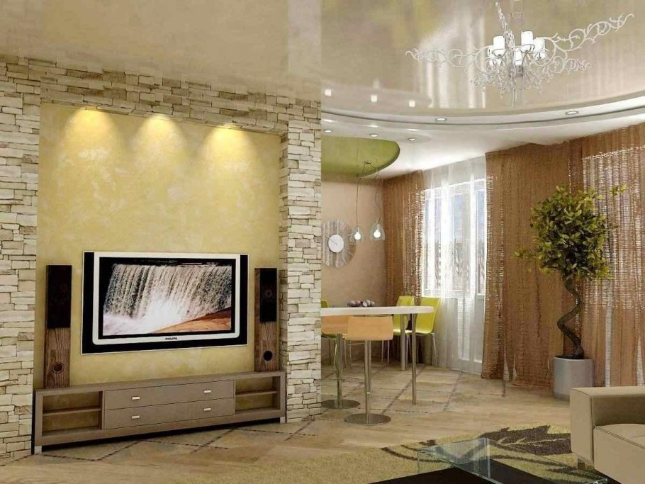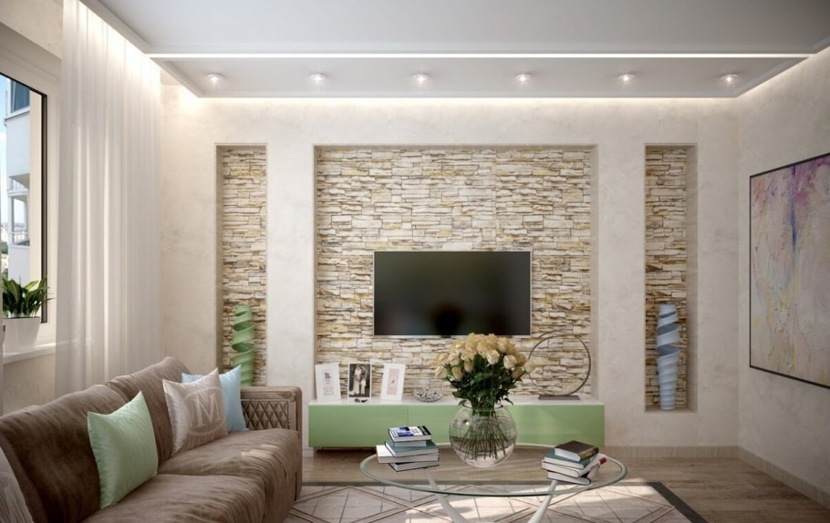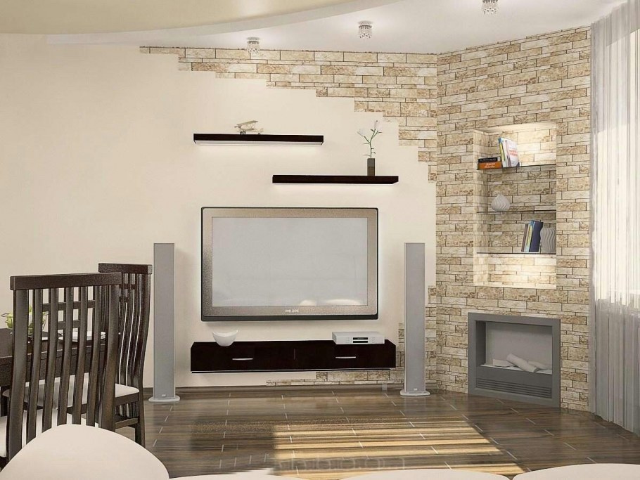 Дизайн зала с камнем одна стена