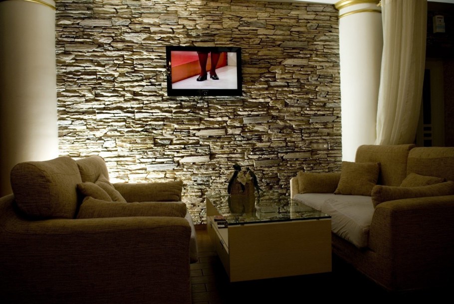 Декоративный камень в интерьере гостиной