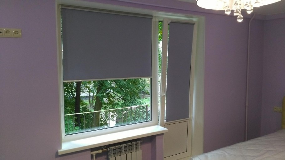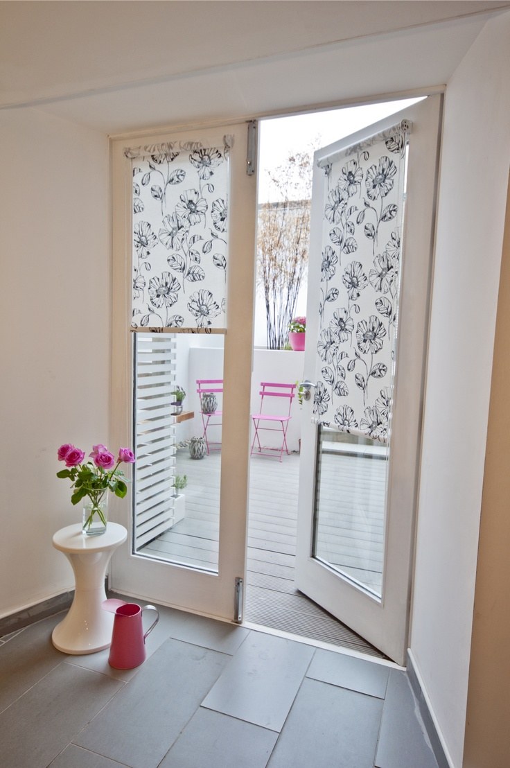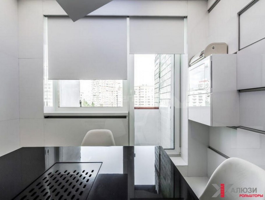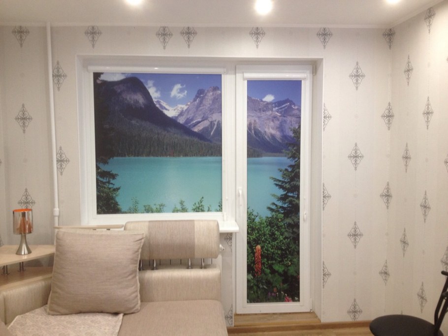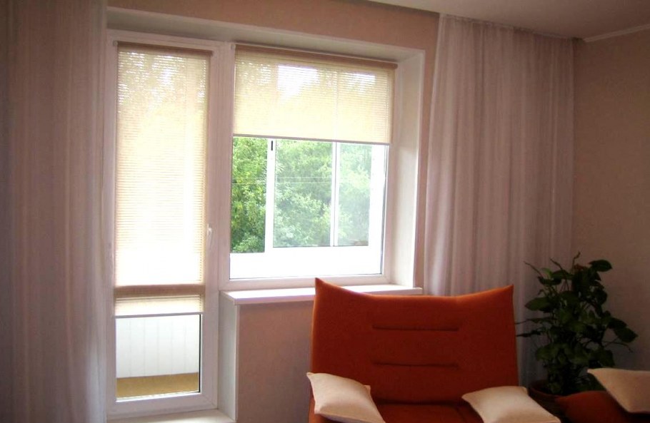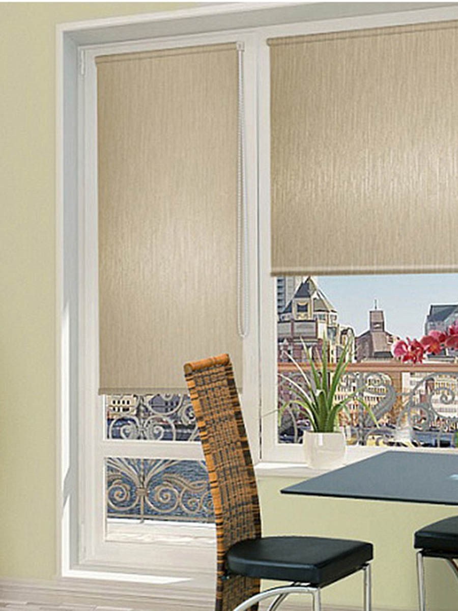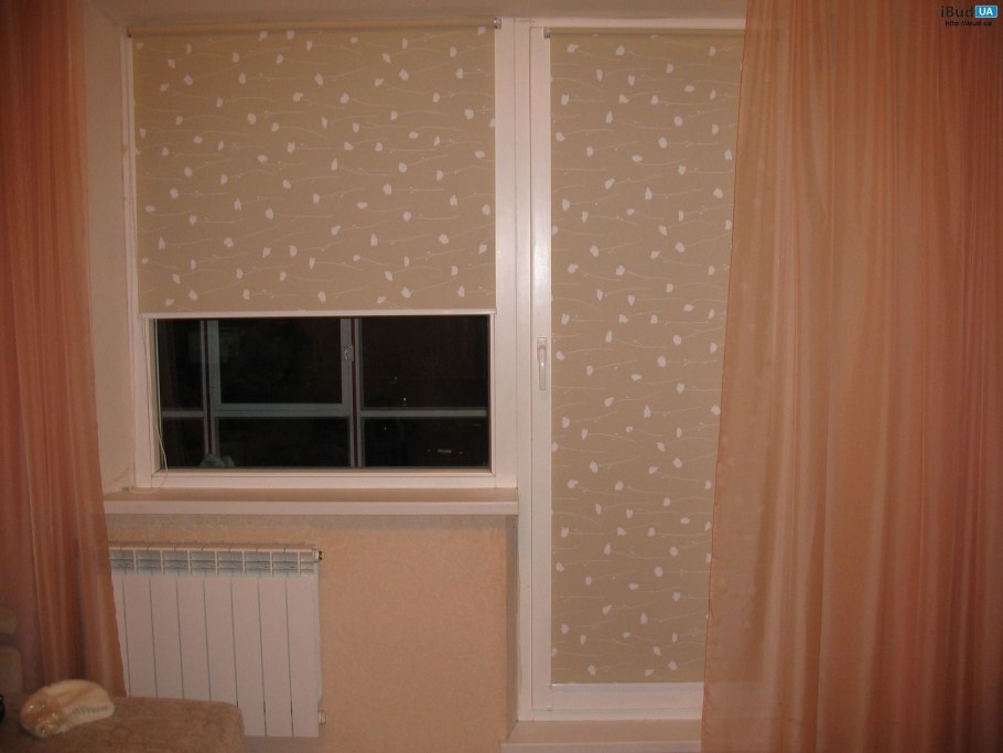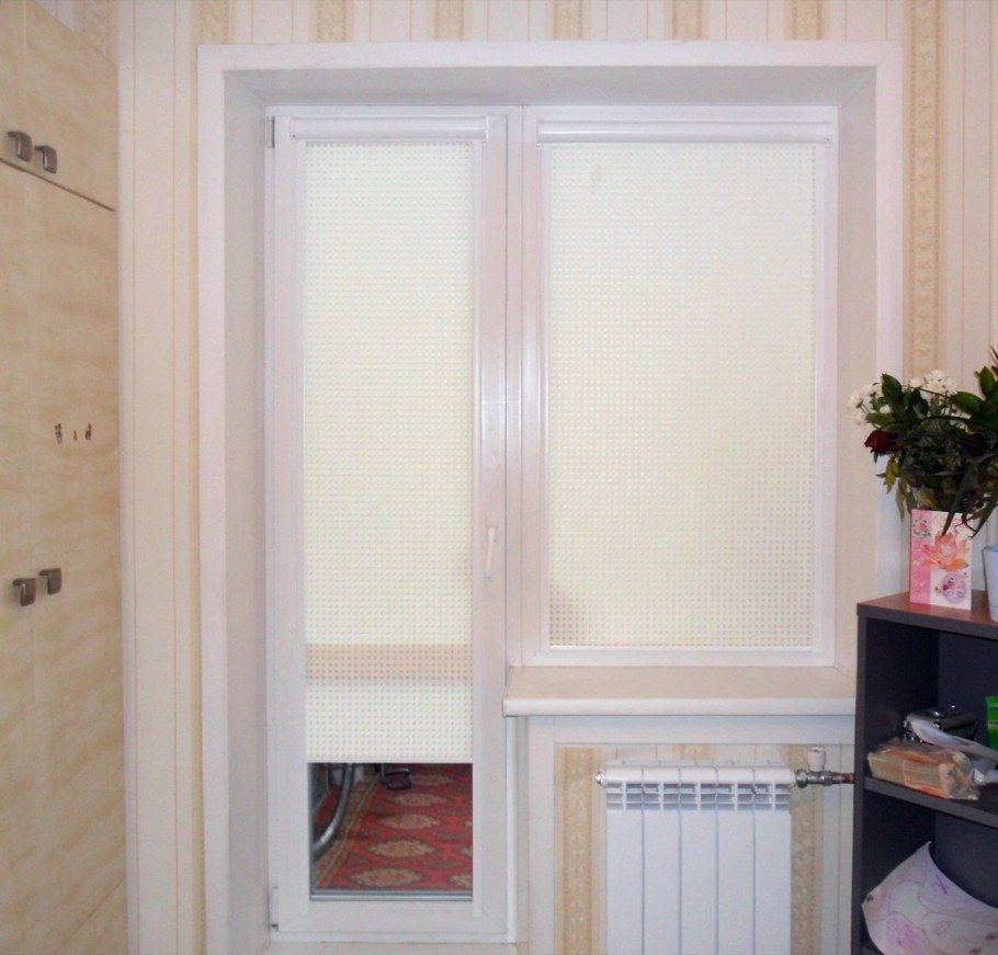 Рулонные шторы на балконную дверь в интерьере (77 фото)