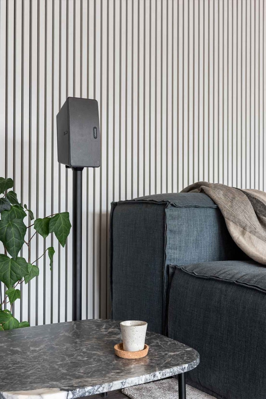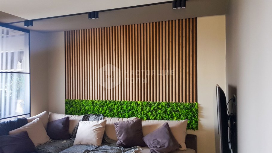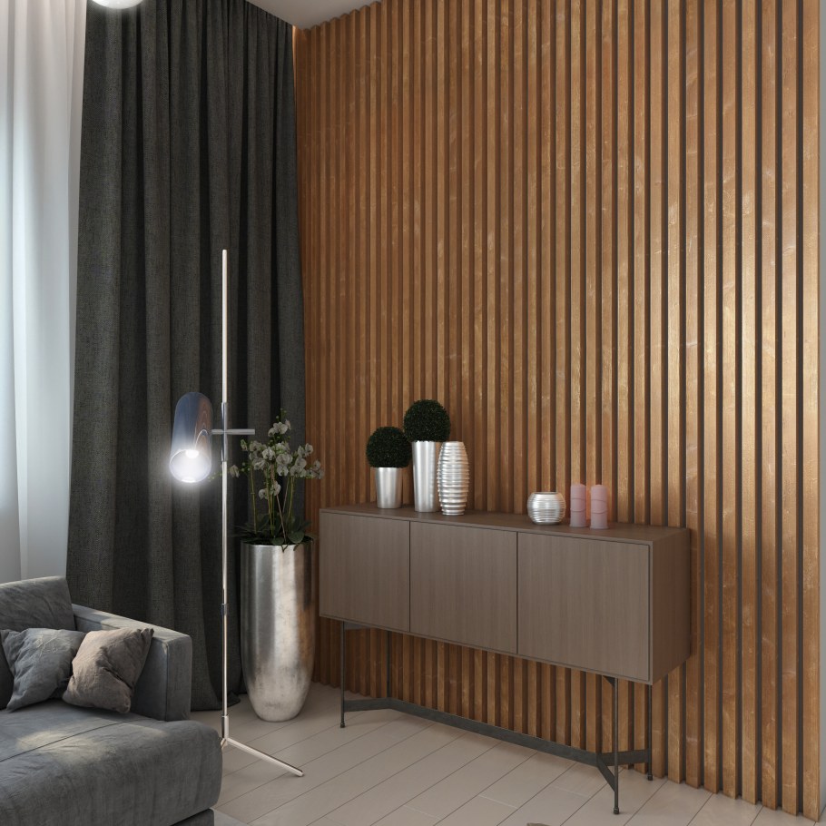 Гостиная с деревянными рейками