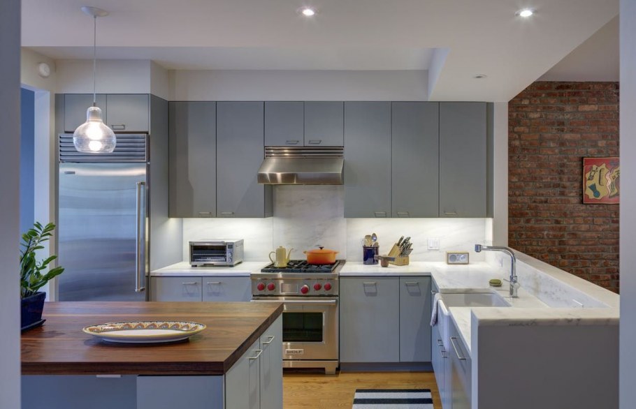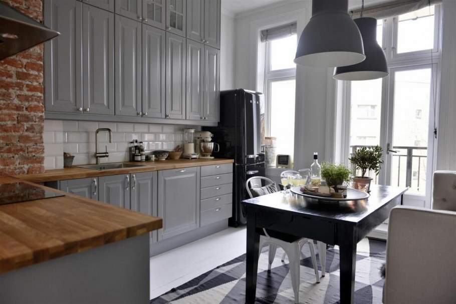Серая кухня с кирпичной стеной