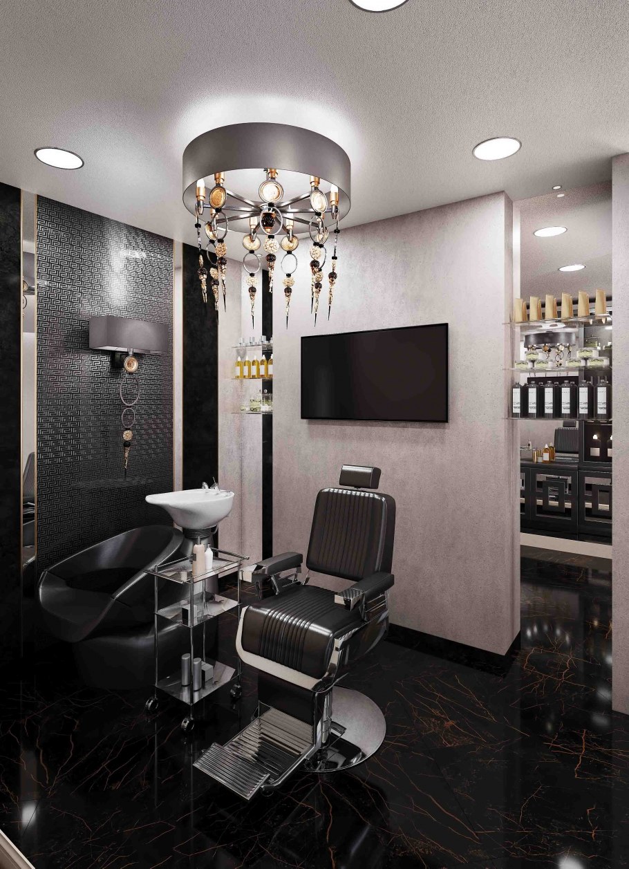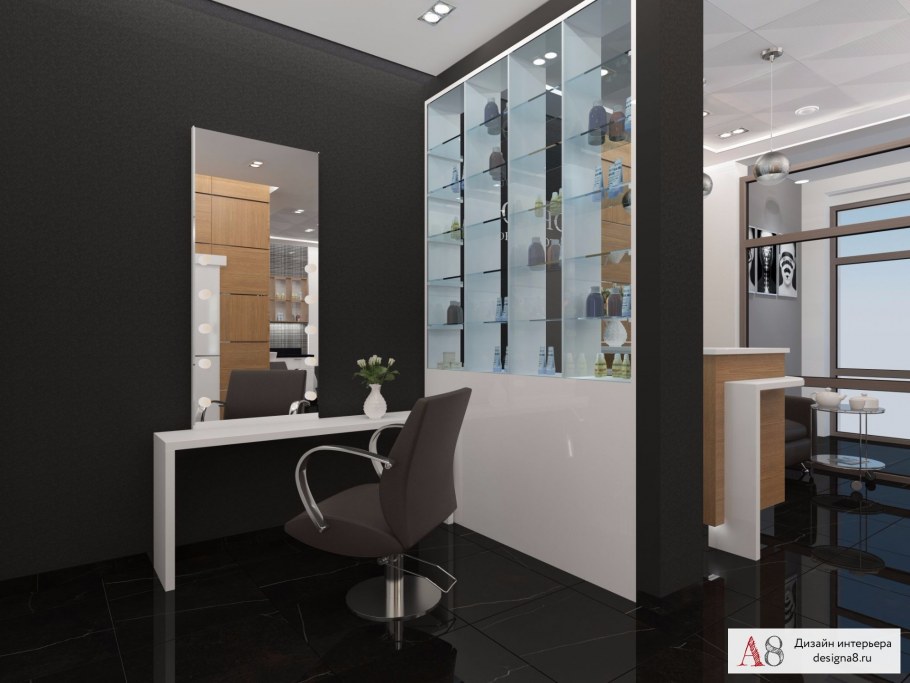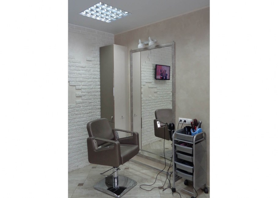 Мебель в таком салоне подбиралась с учётом масштабов помещения — компактные, но эргономичные кресла для клиентов, многофункциональные тумбы для мастеров, открытые полки для аксессуаров, которые не загромождают пространство. В одном из проектов вместо массивной стойки администратора использовали узкий угловой стол, интегрированный в общую композицию интерьера. Это позволило сэкономить место и при этом сохранить все необходимые функции.
