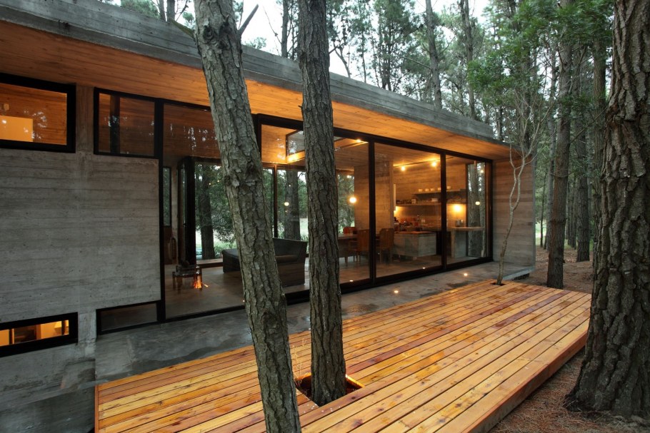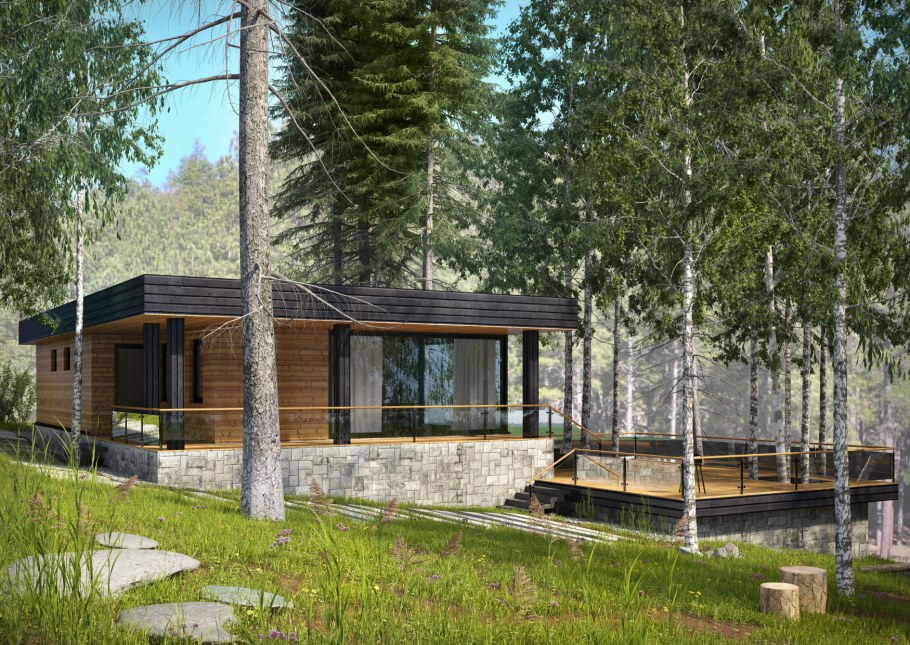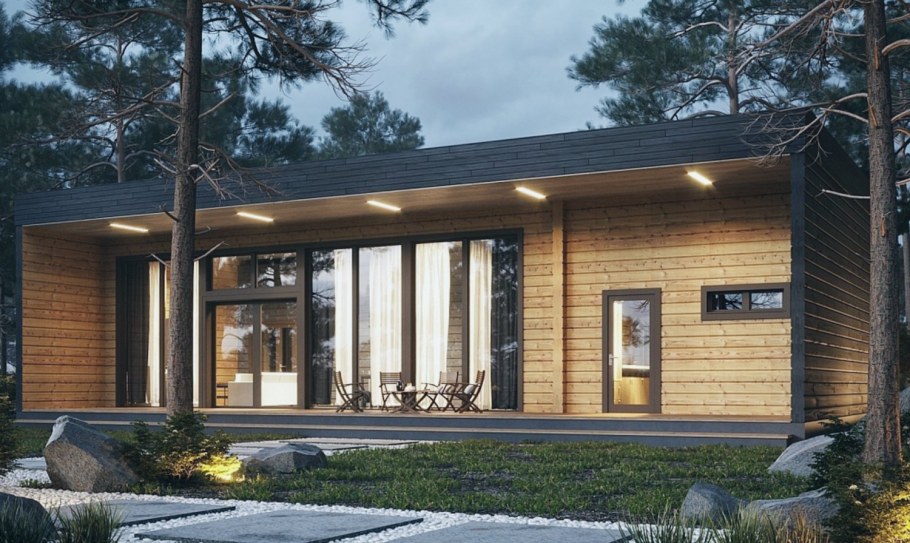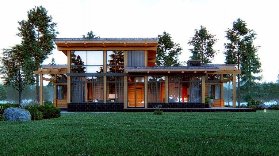 Сруб с плоской крышей и панорамными окнами