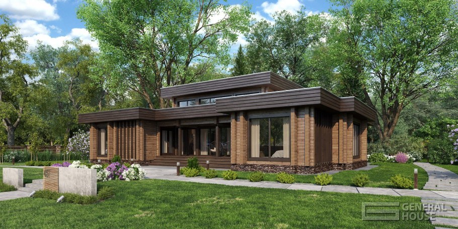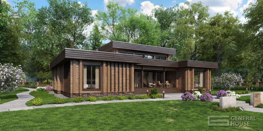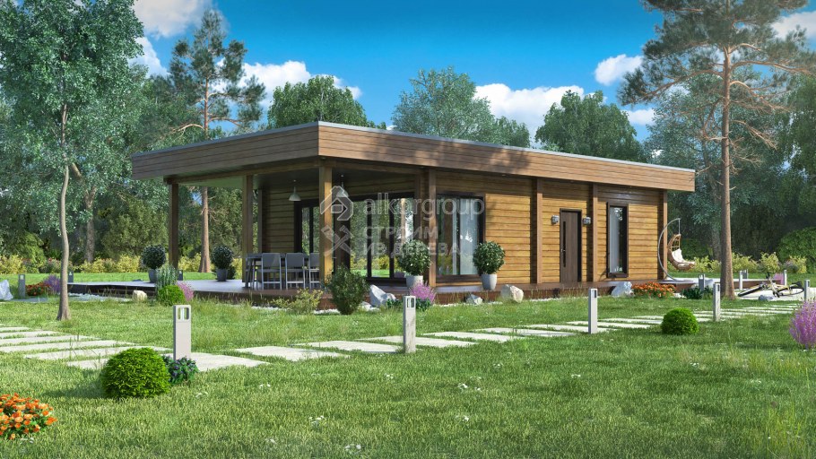 Одноэтажный дом из клееного бруса с плоской крышей