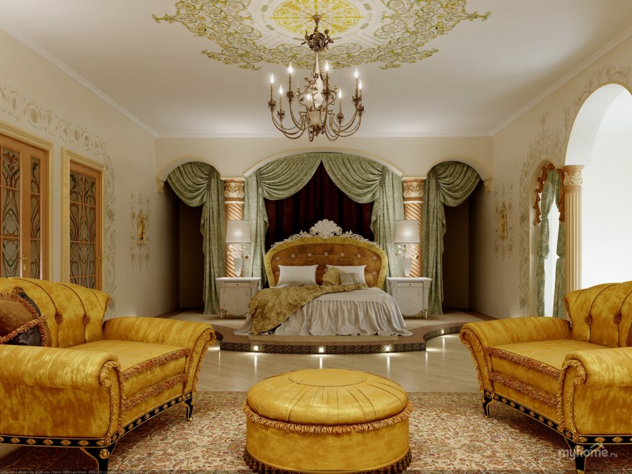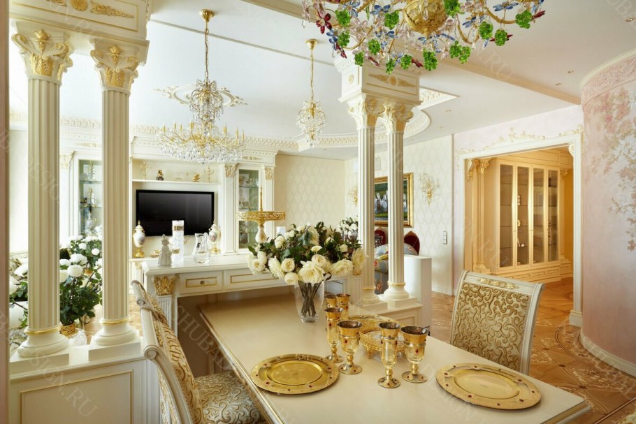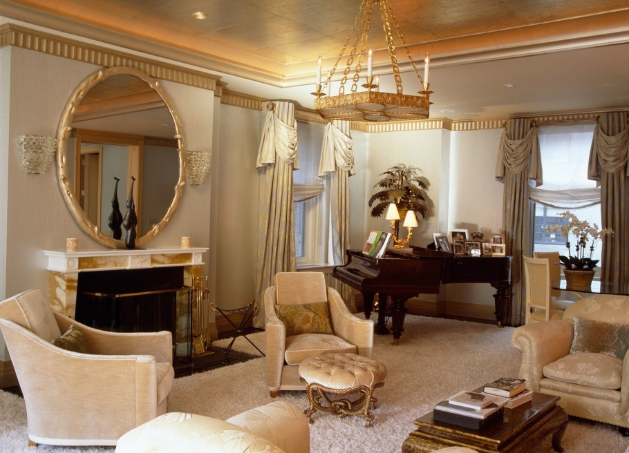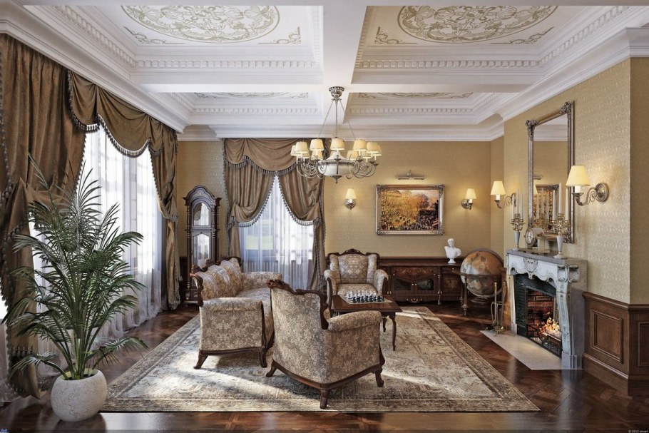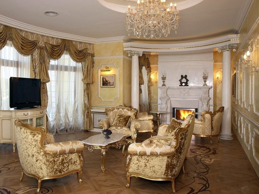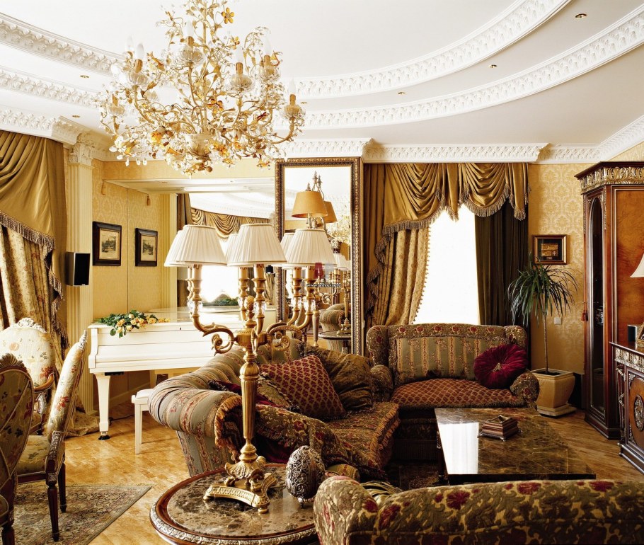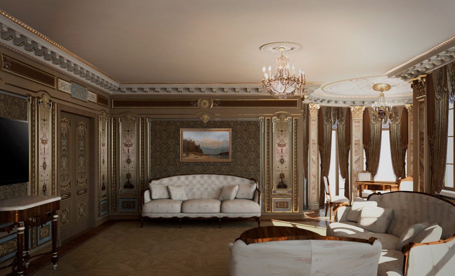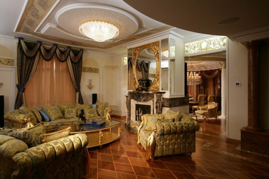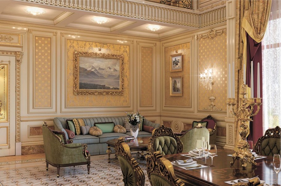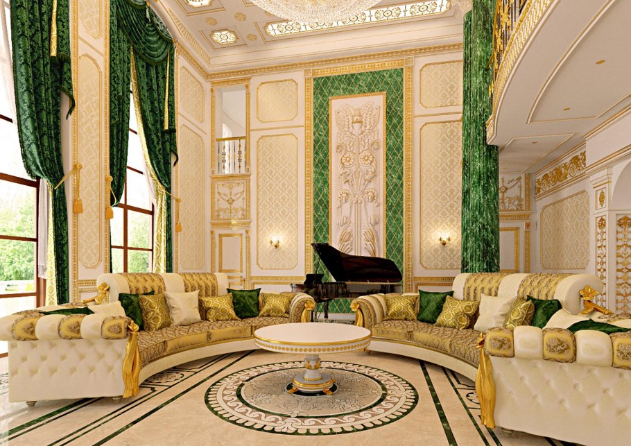 Зелёная гостиная в классическом стиле с золотыми акцентами фото