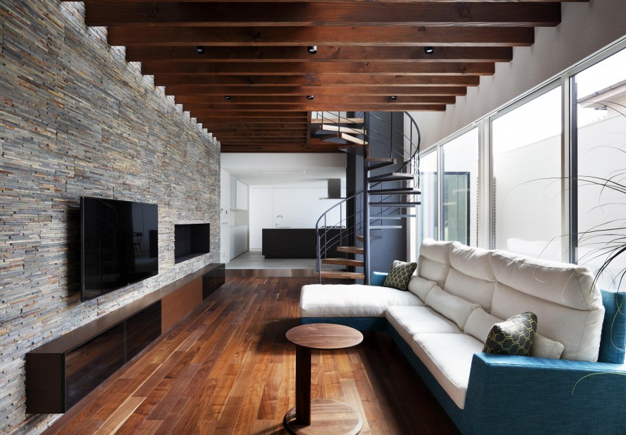 Отделка комнаты камнем и деревом