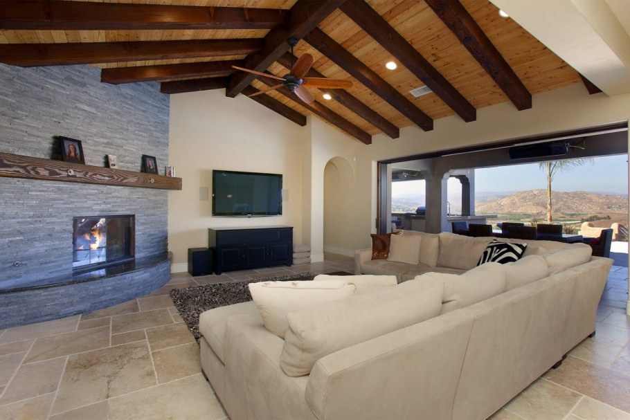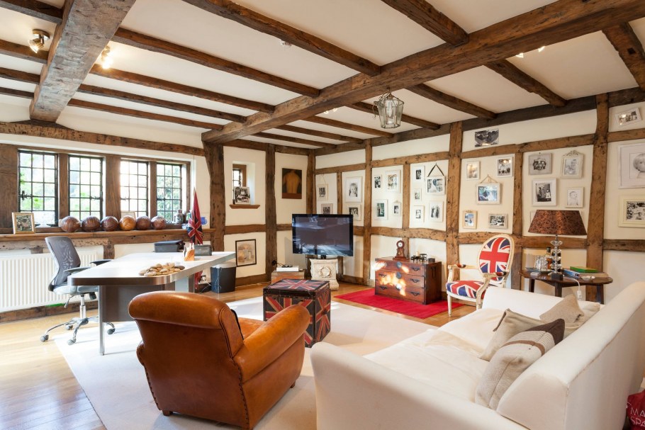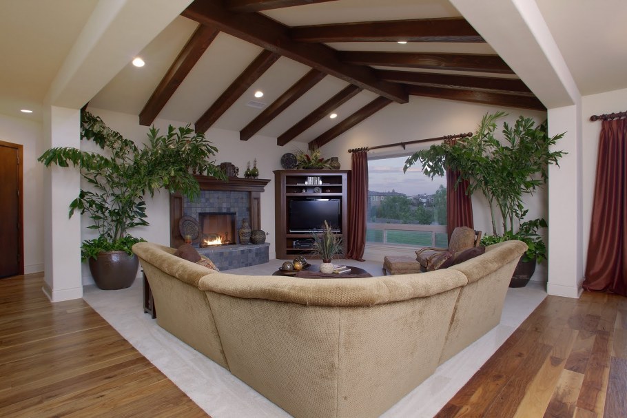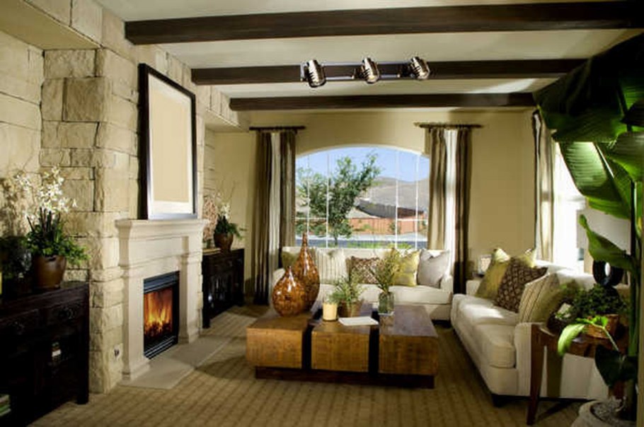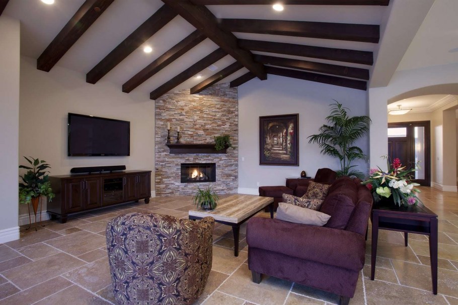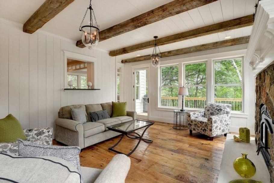 Гостиная с балками на потолке и камином