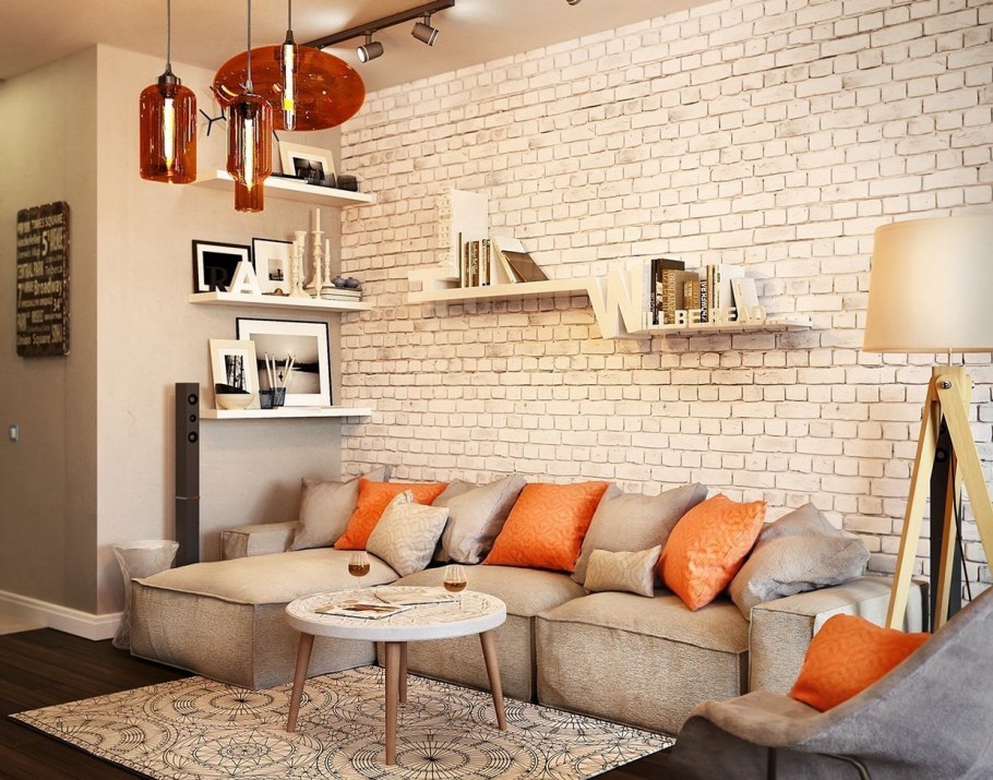 Кирпичная стена в интерьере гостиной