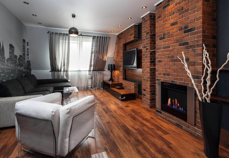Кирпич в интерьере гостиной