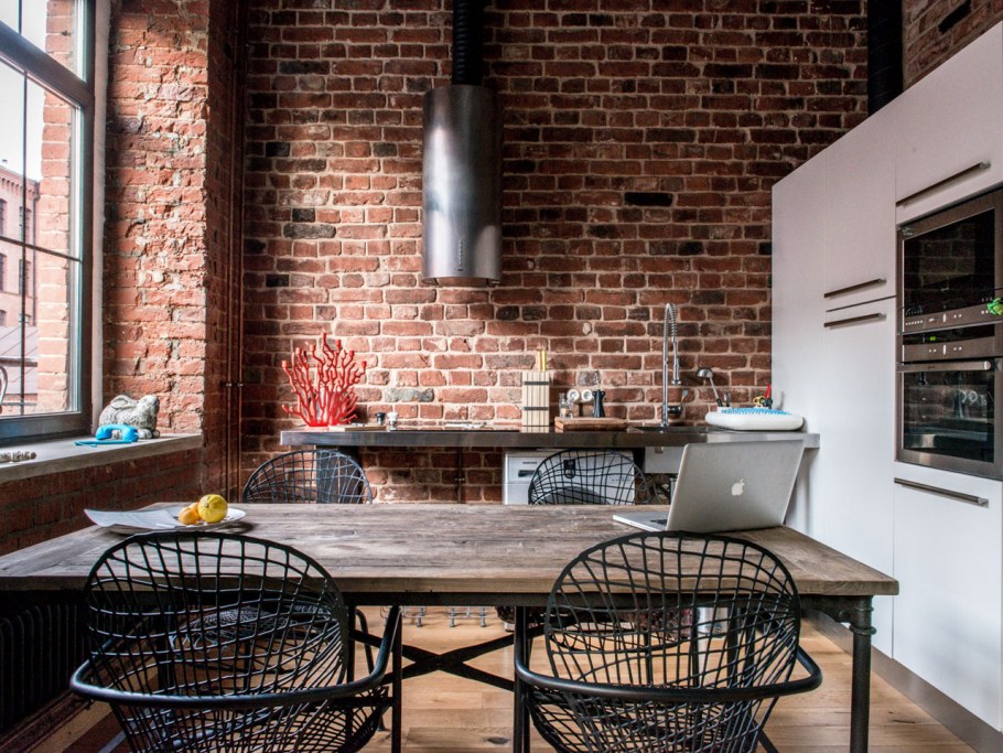 Кухня лофт с красным кирпичом