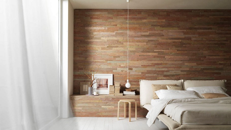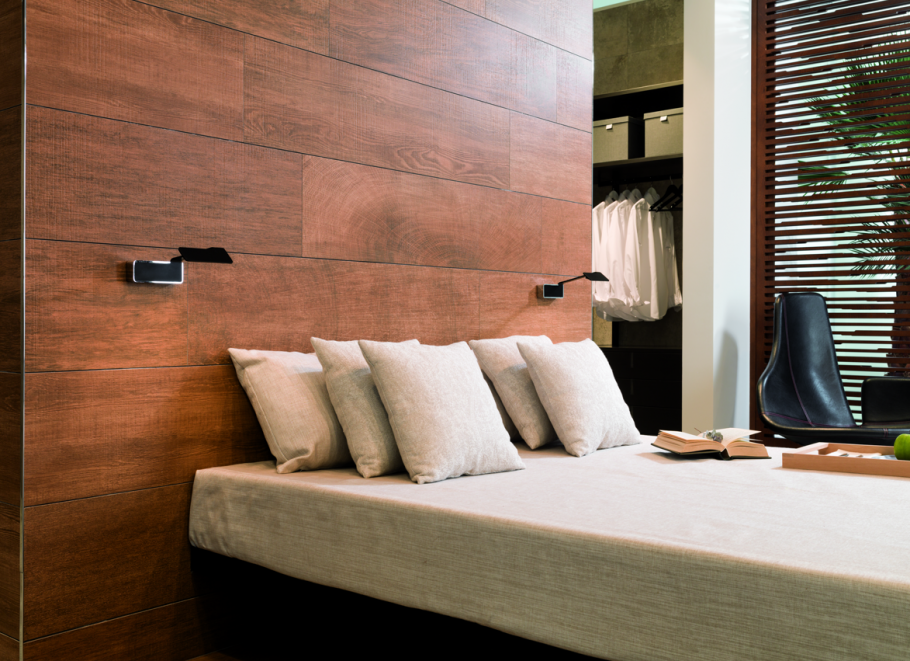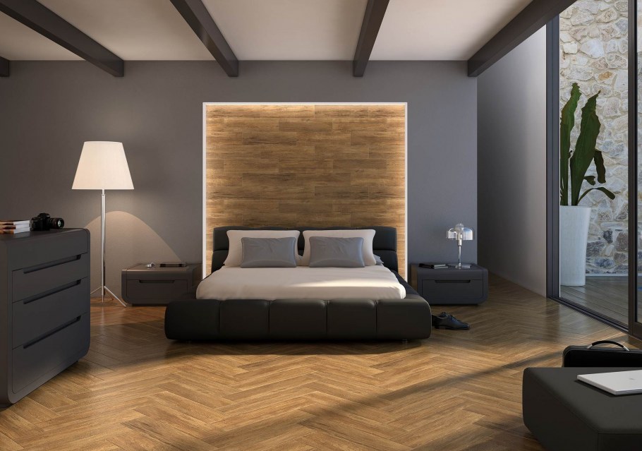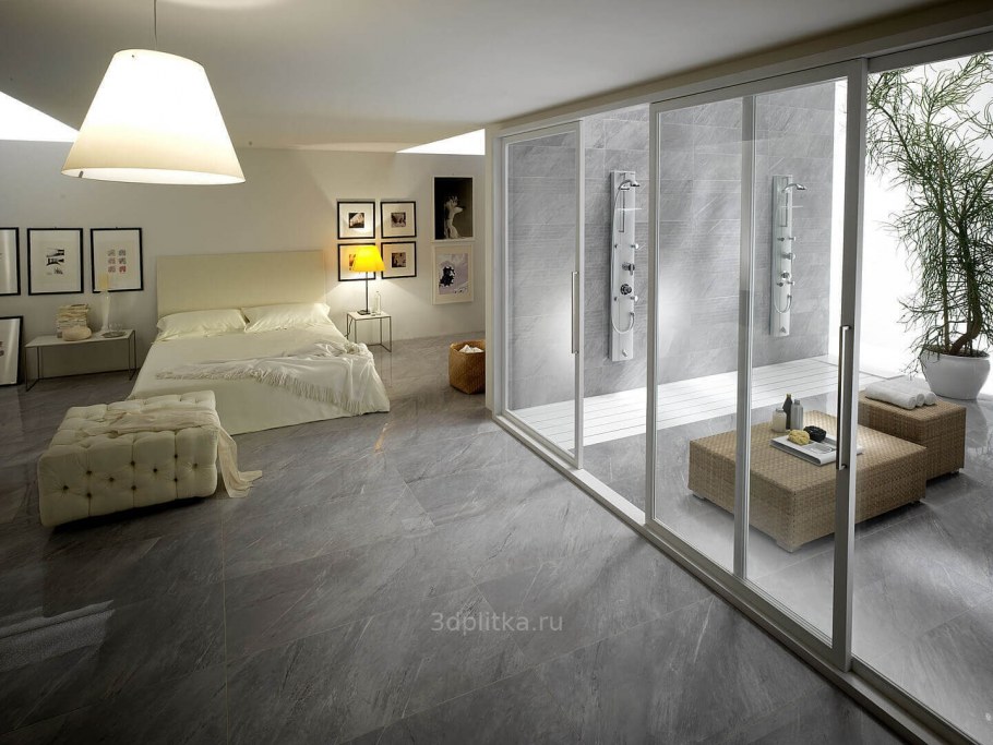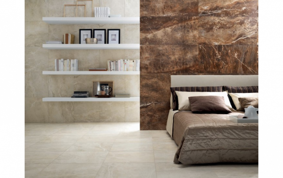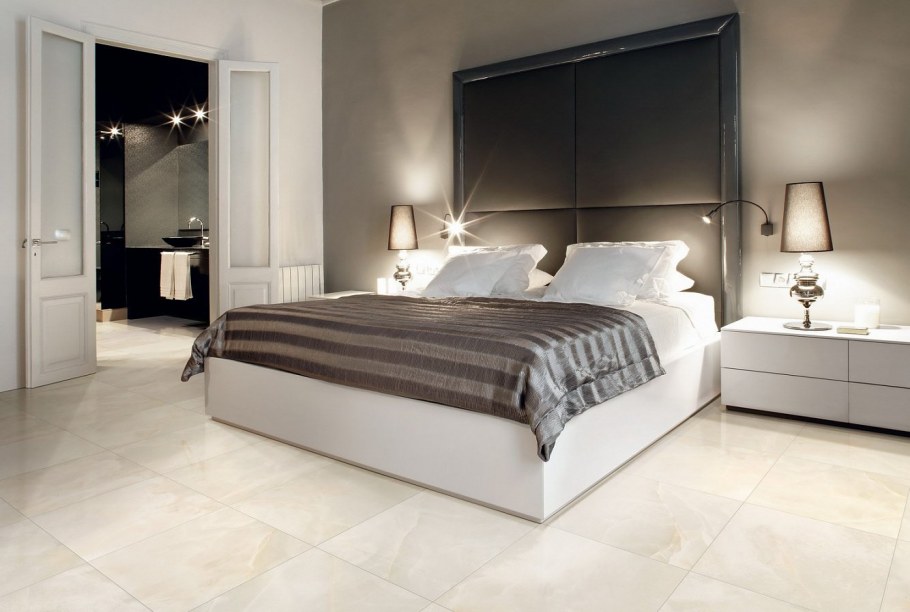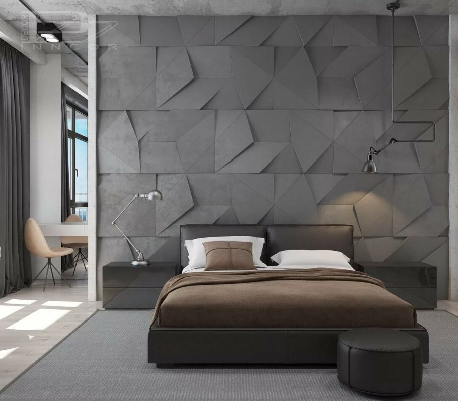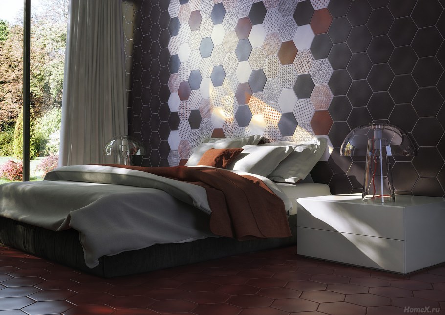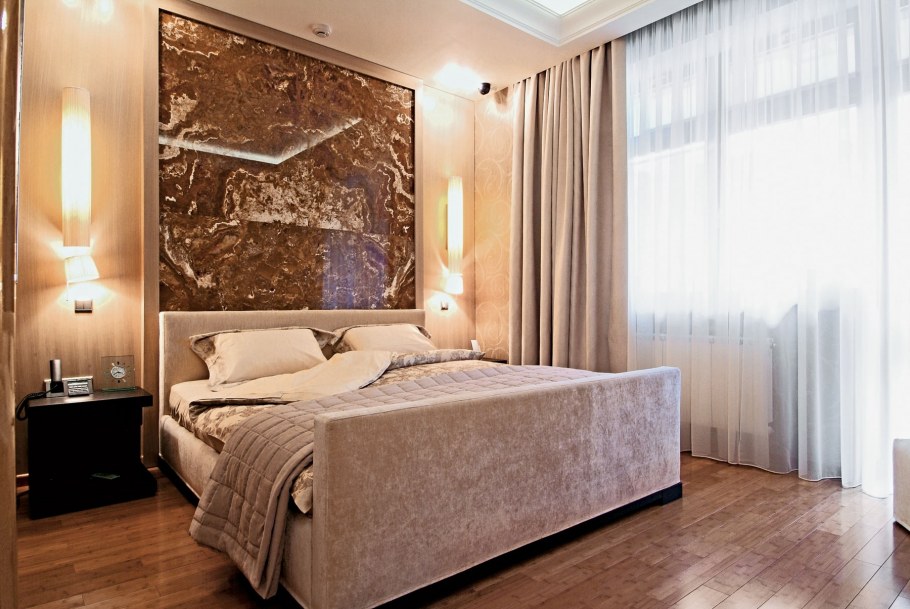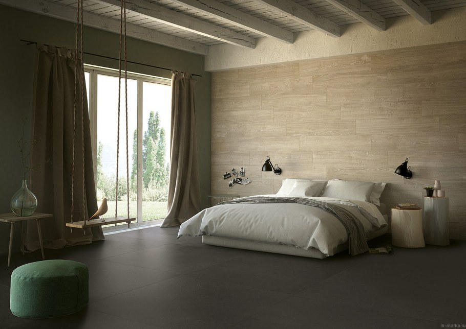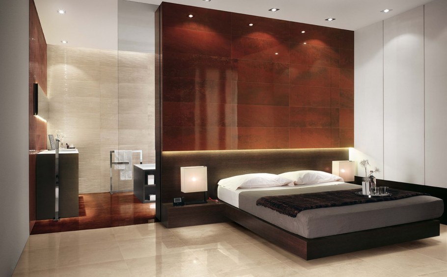 Керамогранит в спальне на стене в интерьере (76 фото)