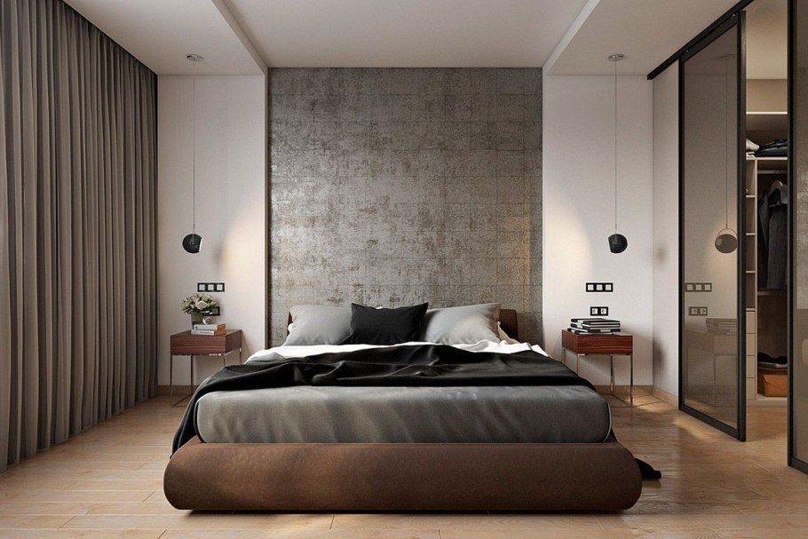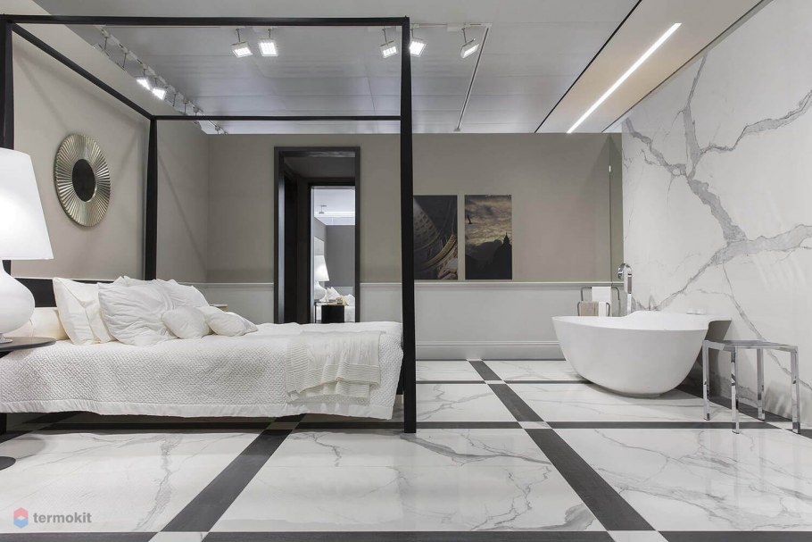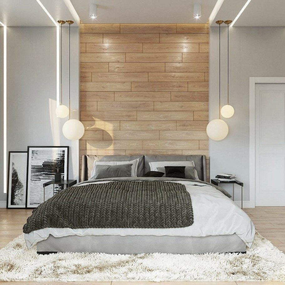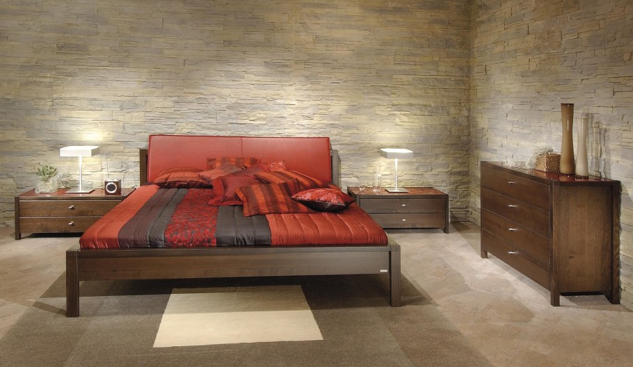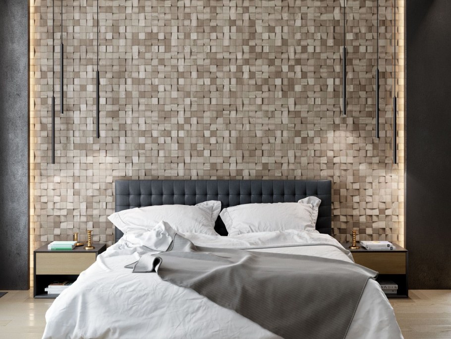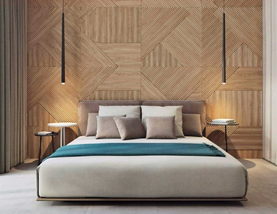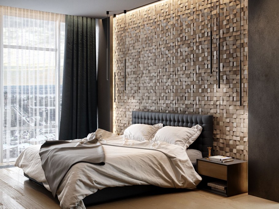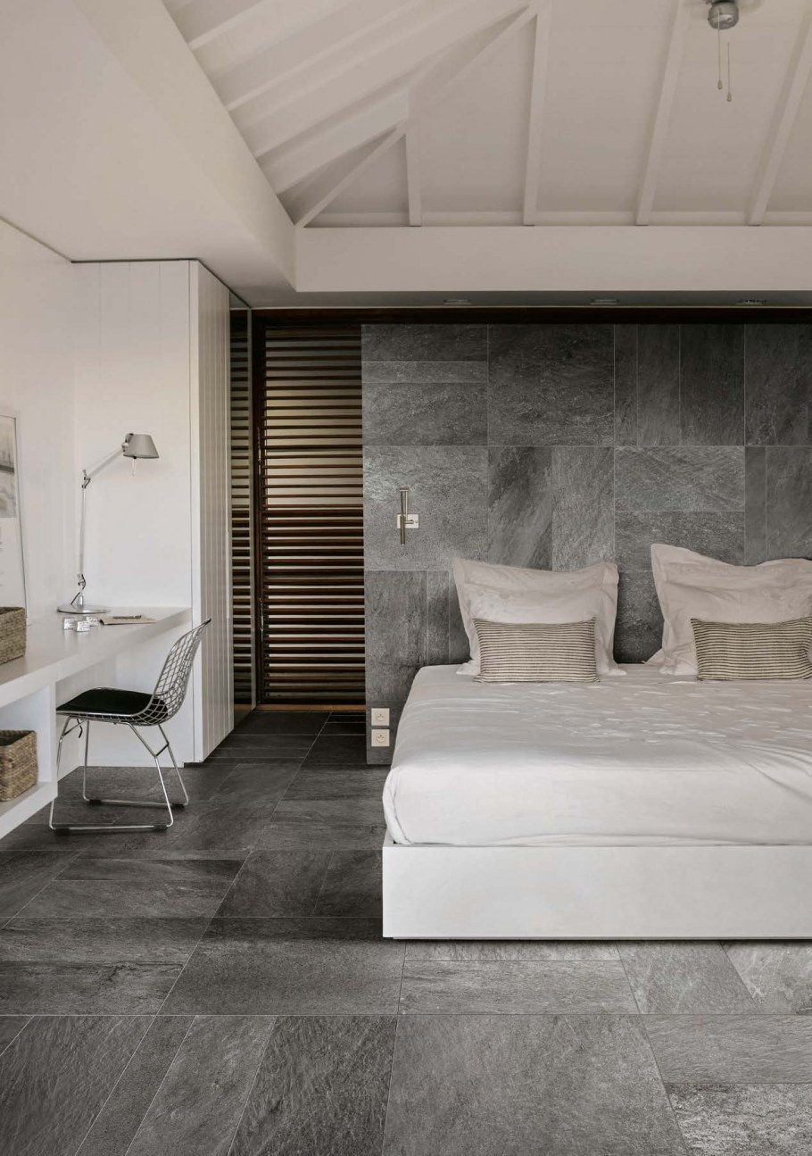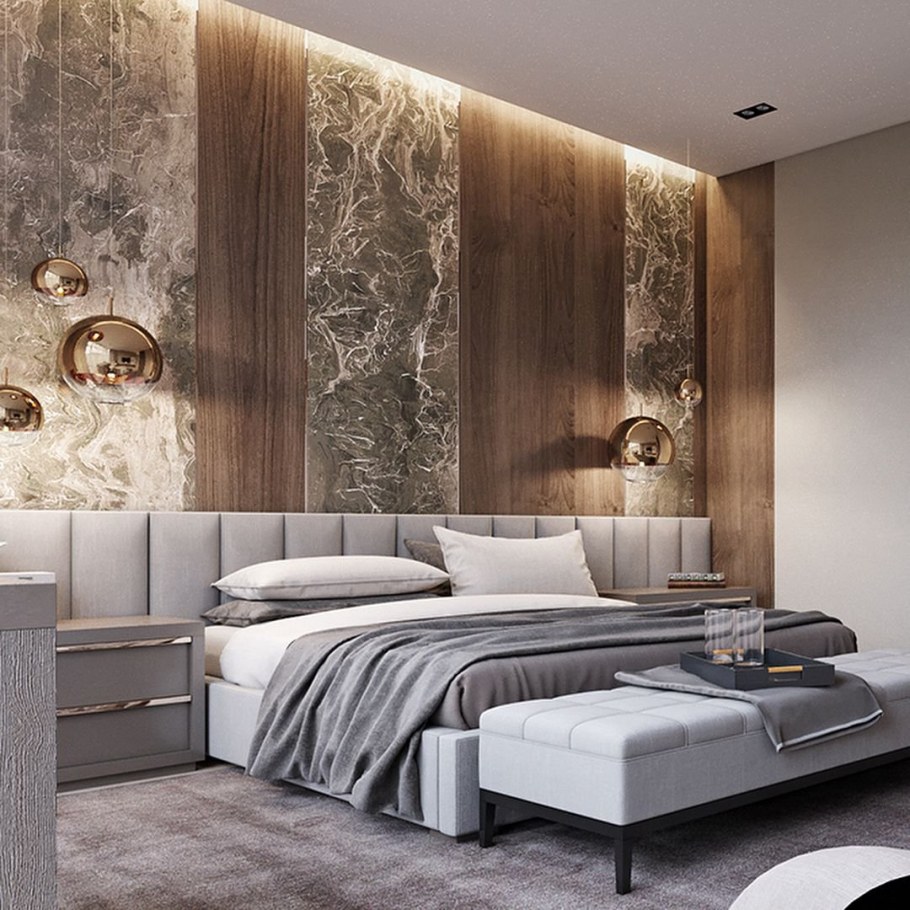 Керамогранит в спальне на стене в интерьере (76 фото)