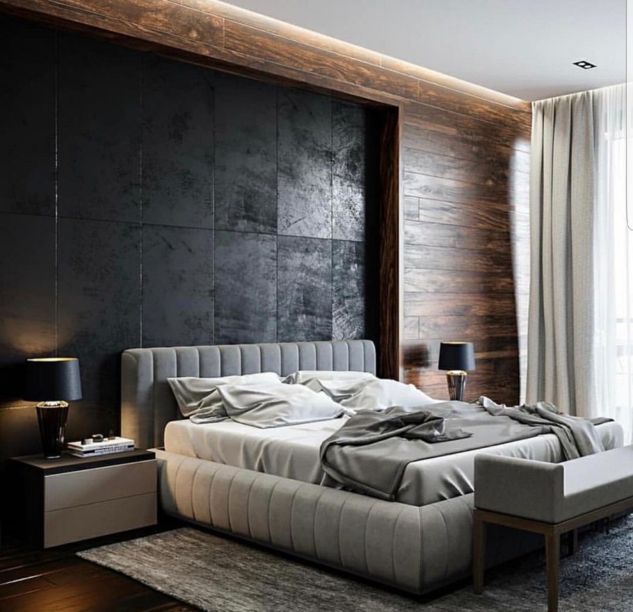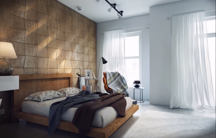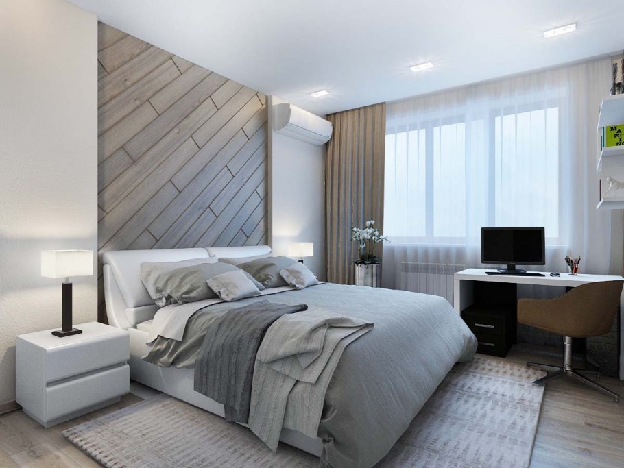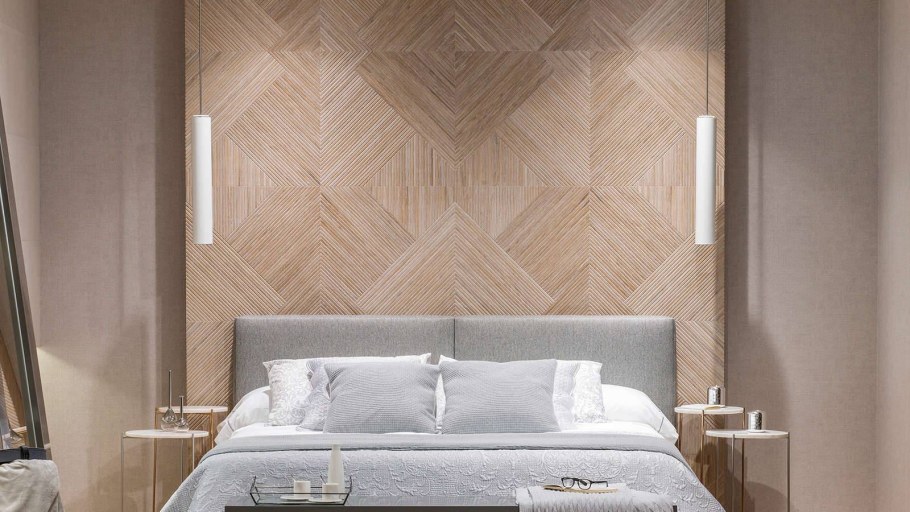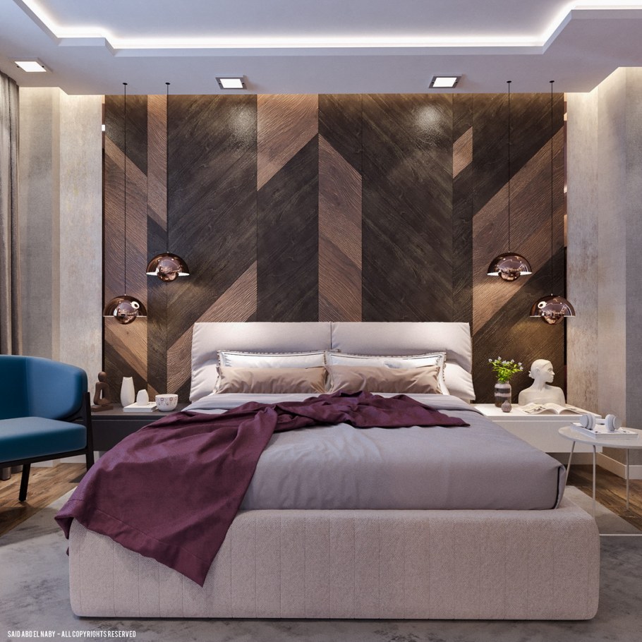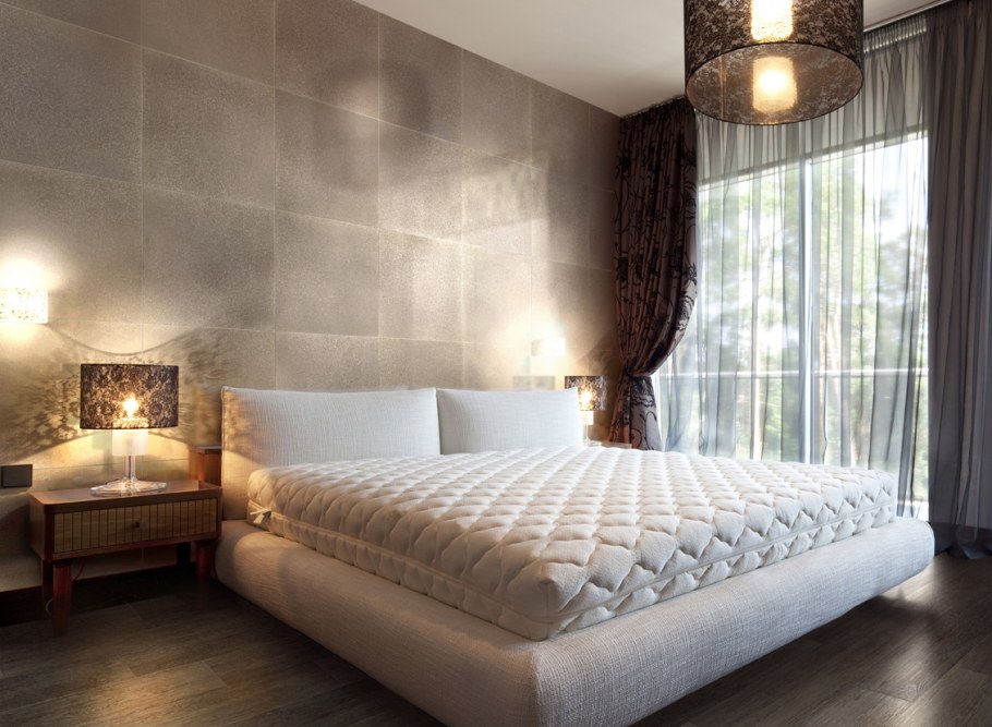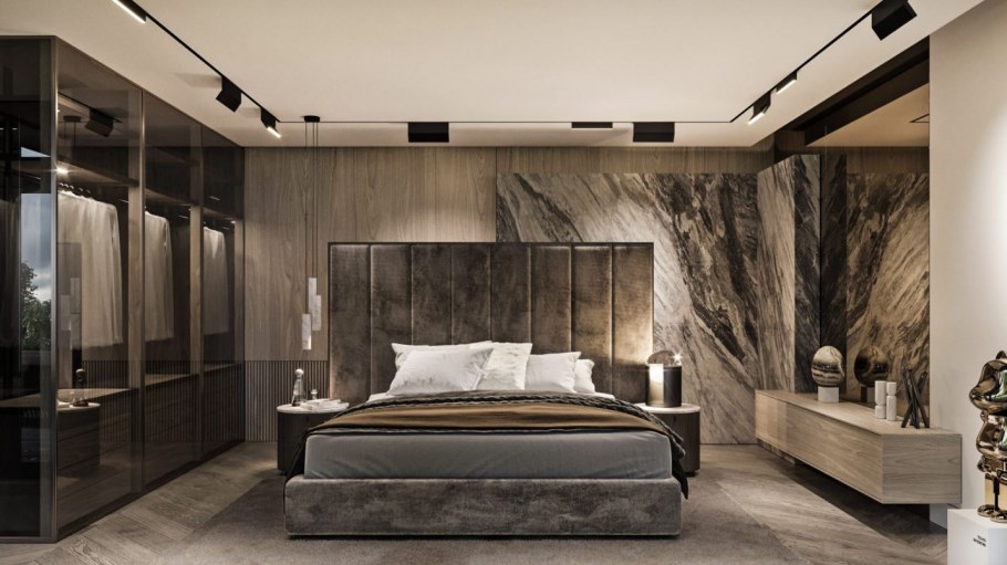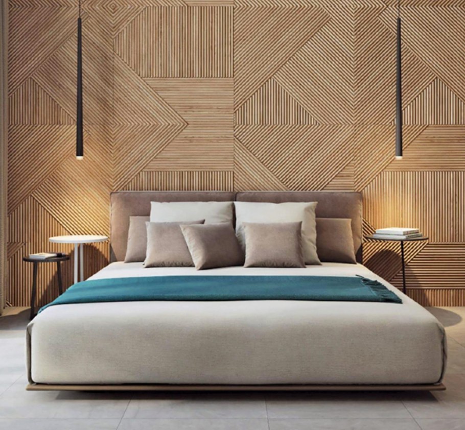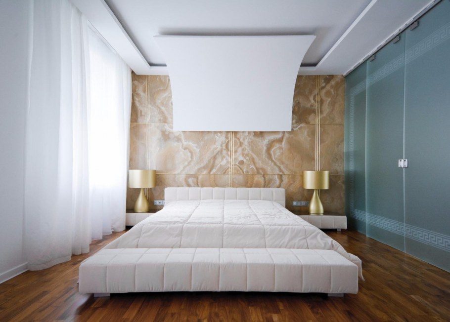 Керамогранит в спальне на стене в интерьере (76 фото)