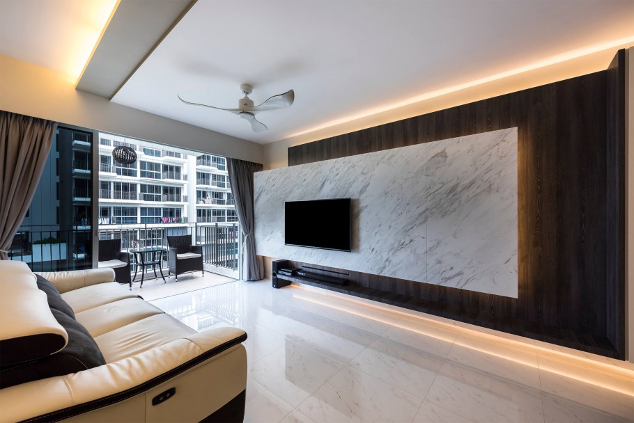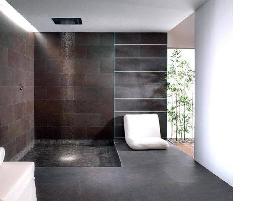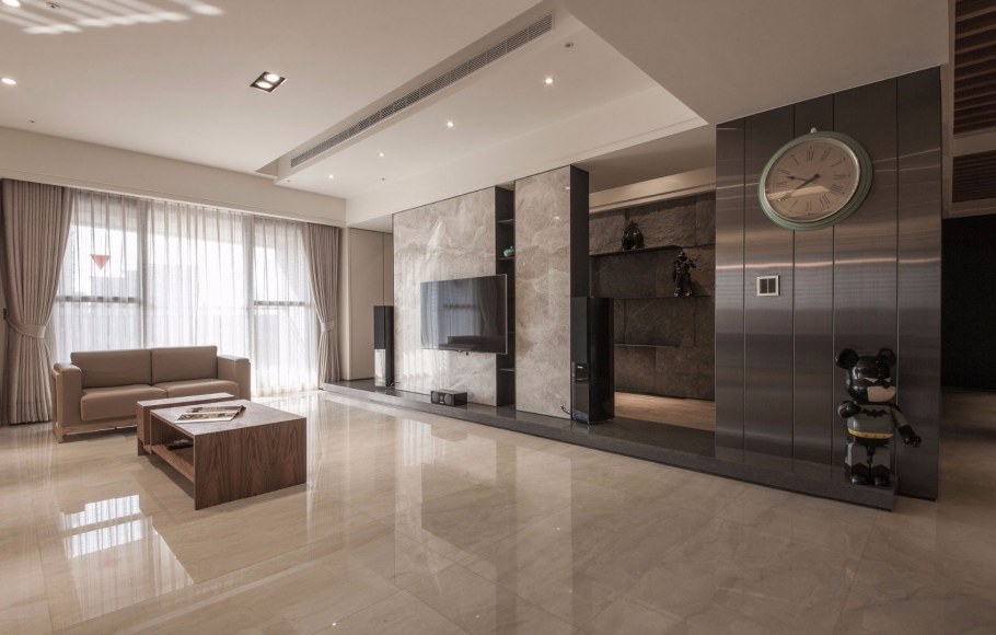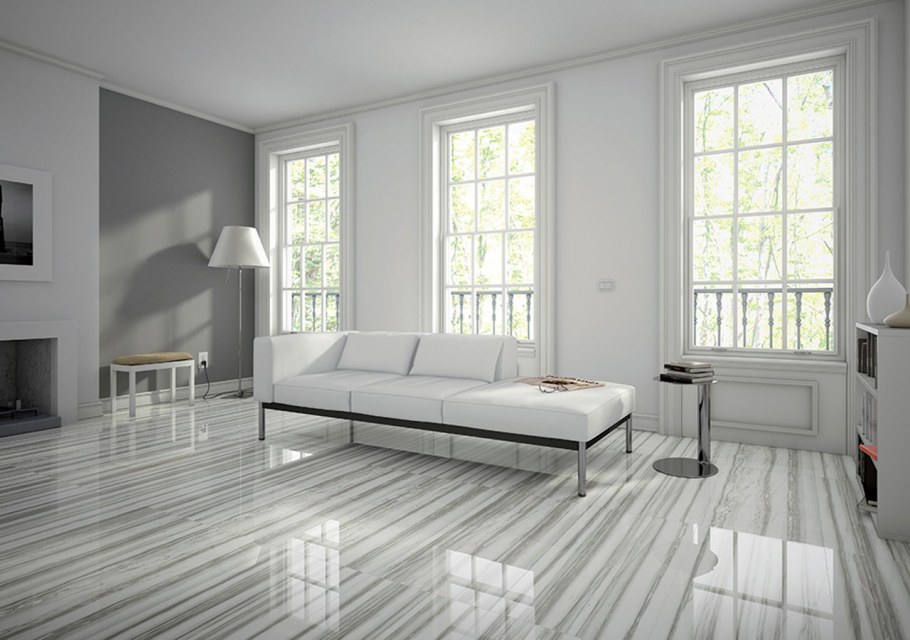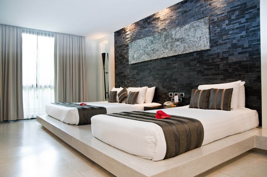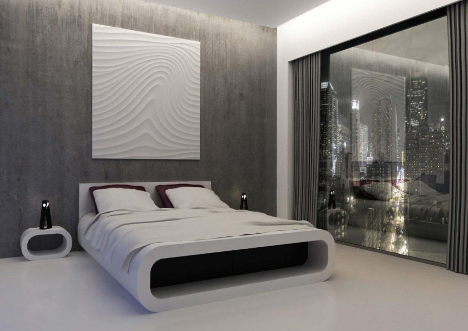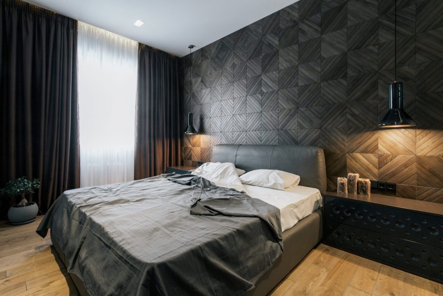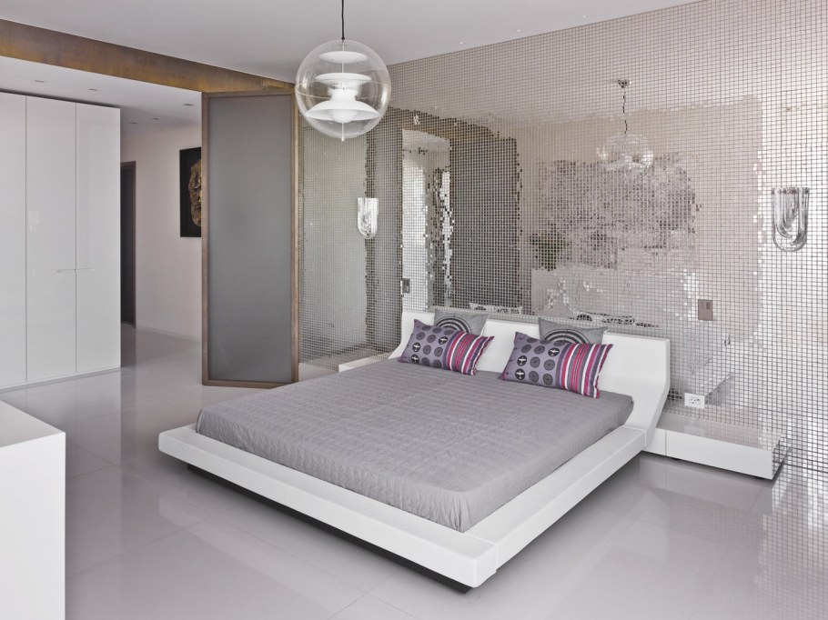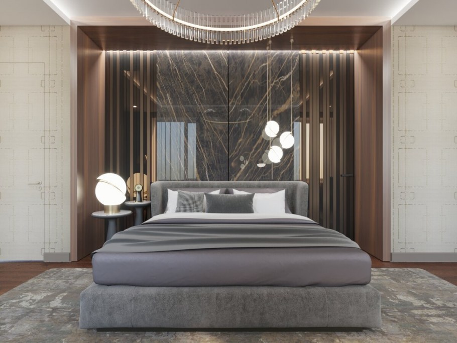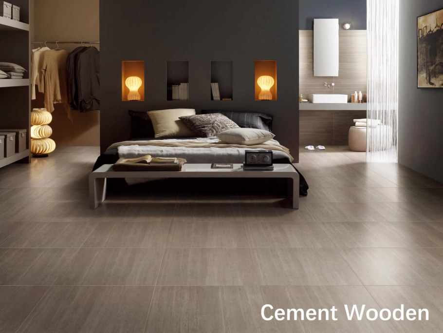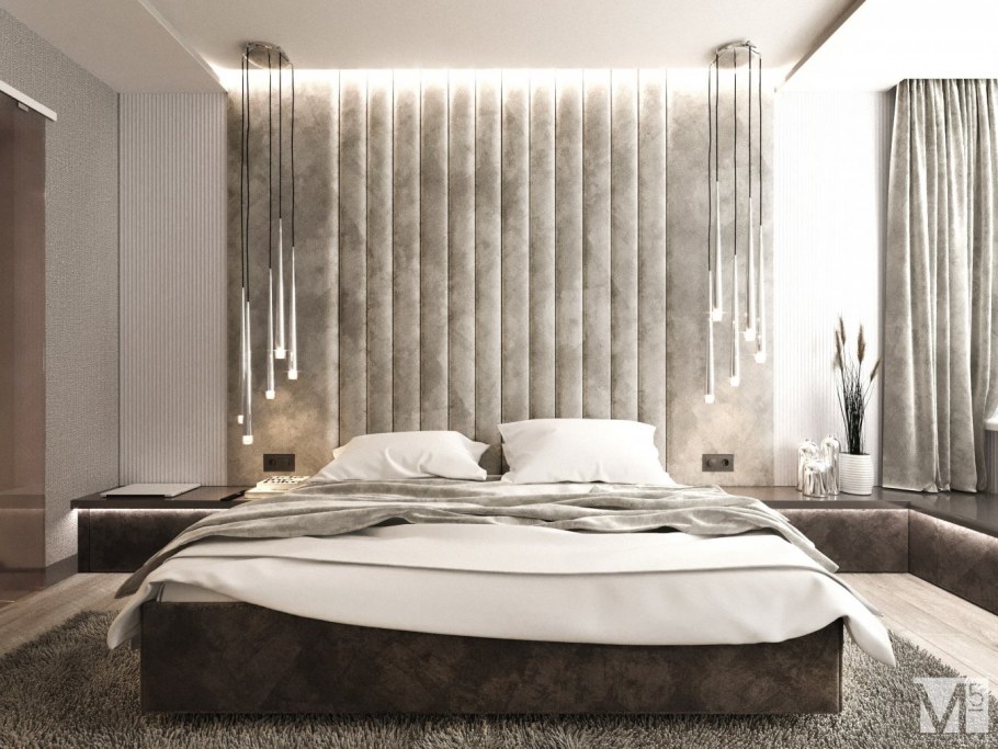Керамогранит в спальне на стене в интерьере (76 фото)