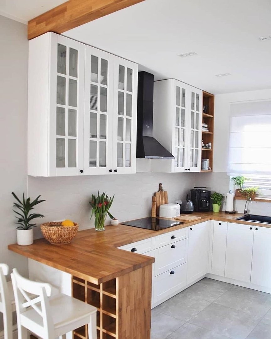 Сканди кухня белая с деревянной столешницей