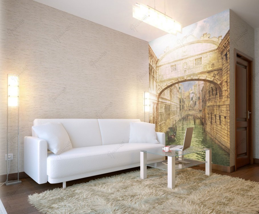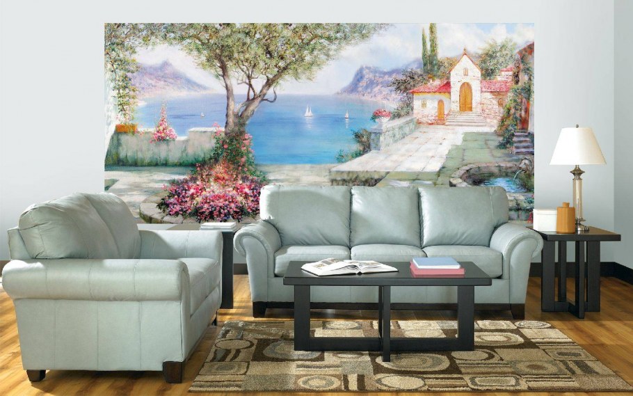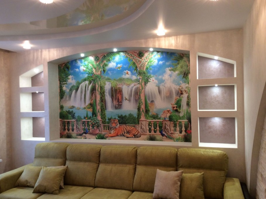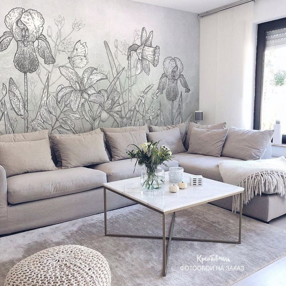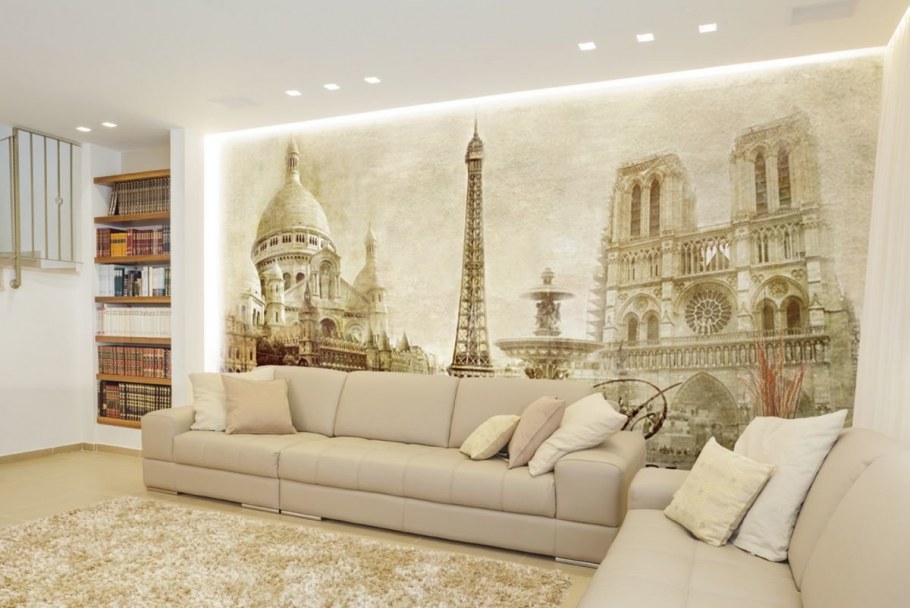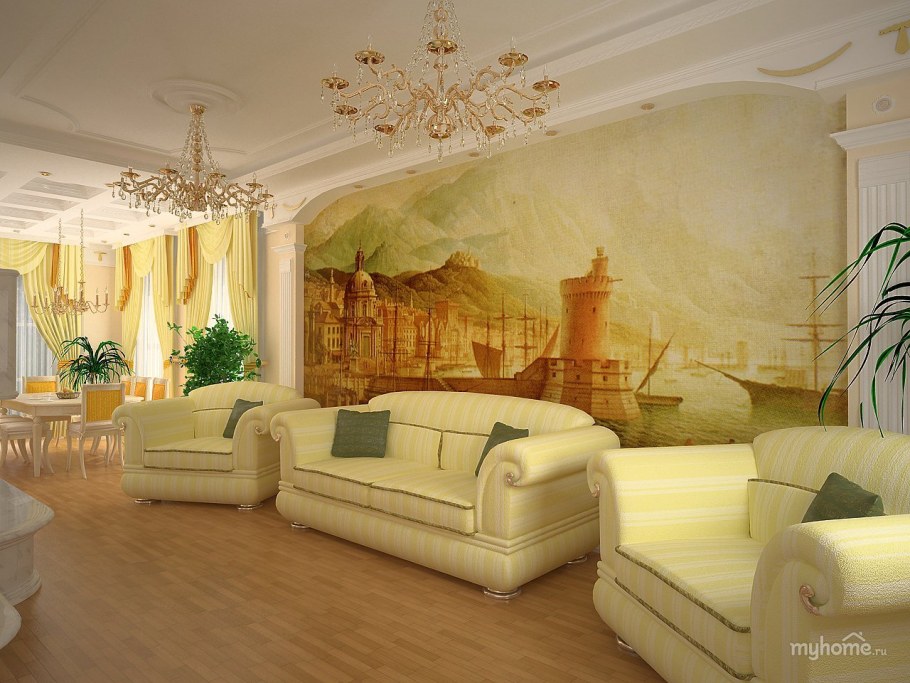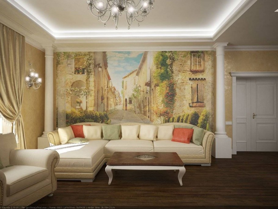 Фрески на стену в интерьере гостиной над диваном (80 фото)