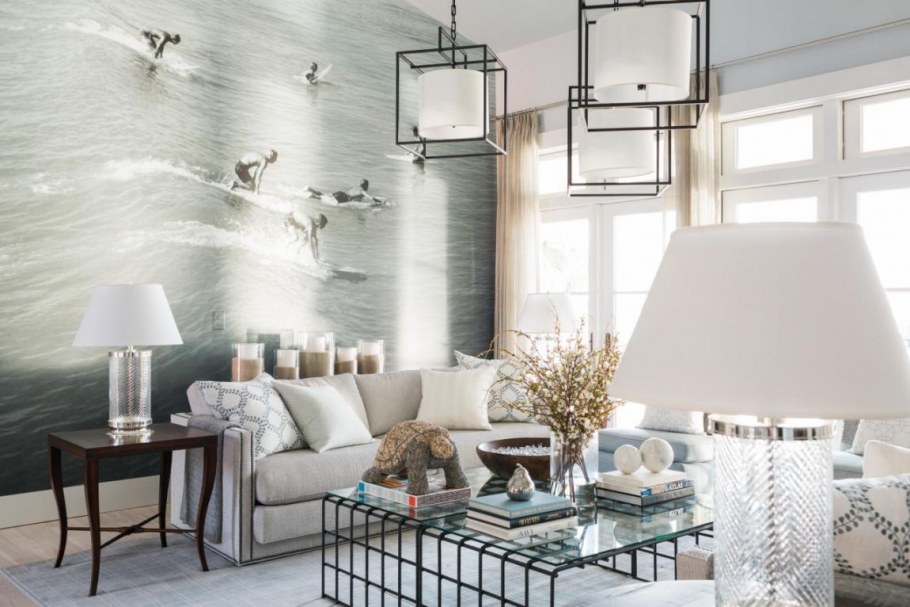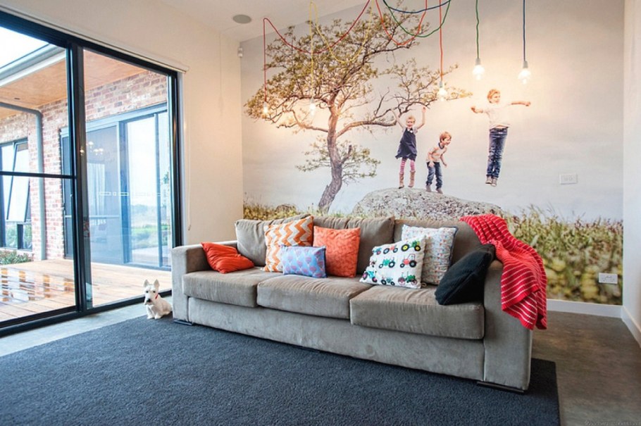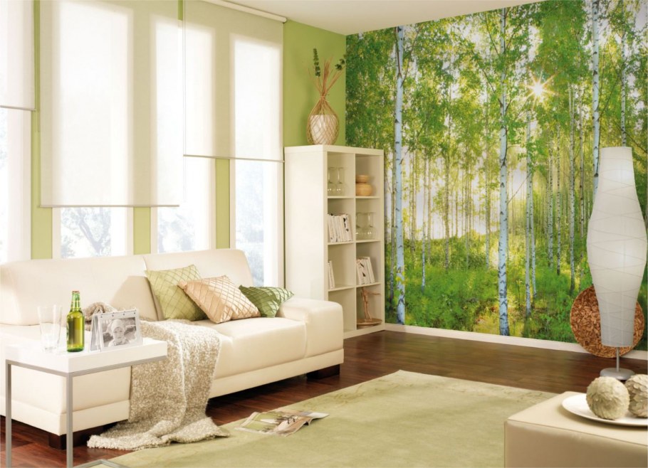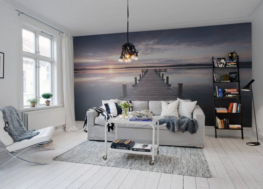 Фотообои за диваном в интерьере