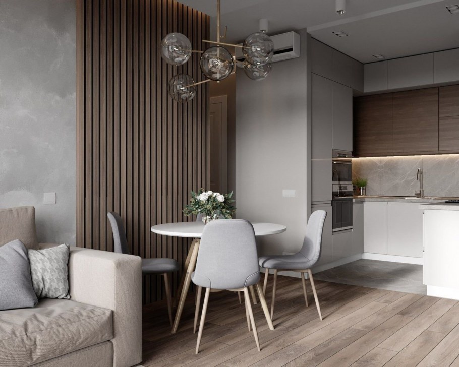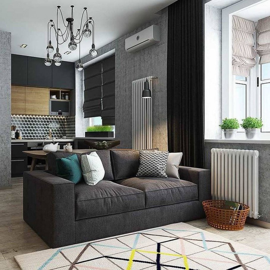 Кухня гостиная 17кв в серых тонах прямоугольная