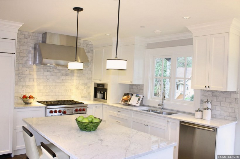 Белая кухня в интерьере с реальным фартуком (78 фото)