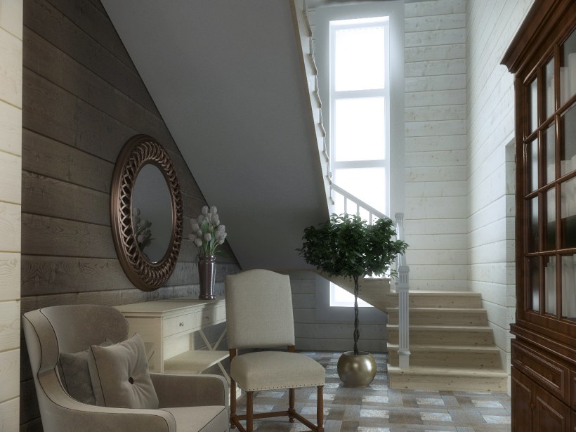 Прихожая в брусовом доме с лестницей
