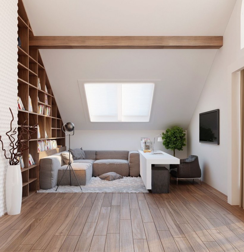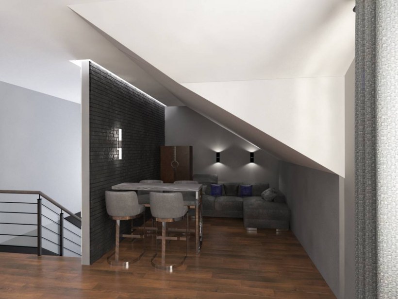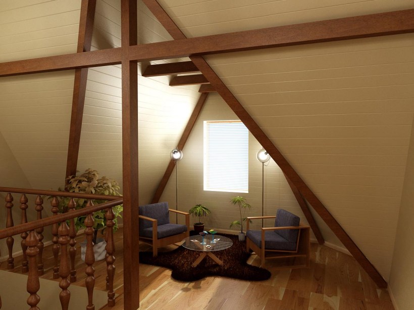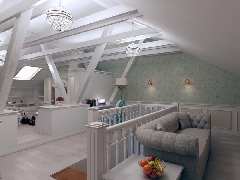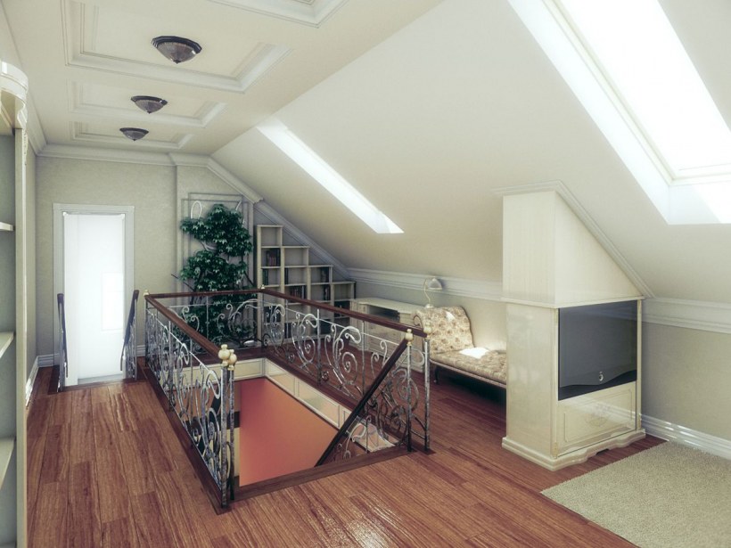 Интерьер мансарды с лестницей