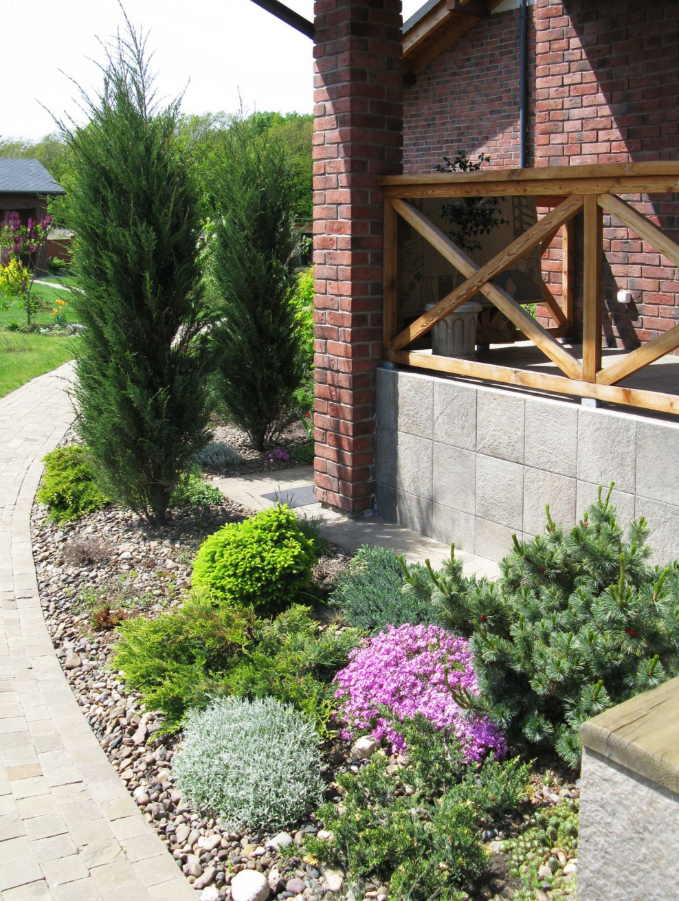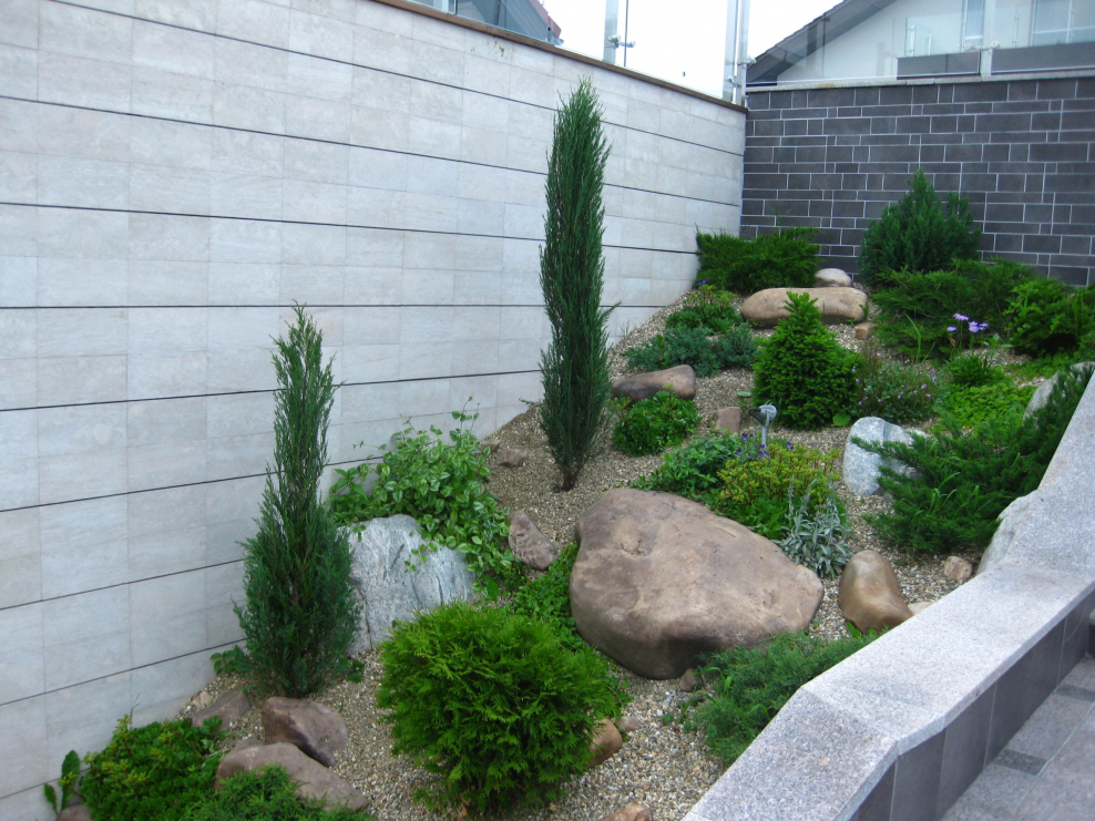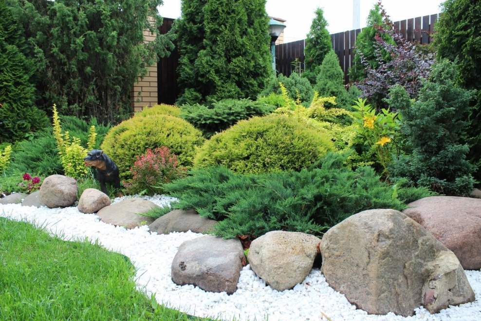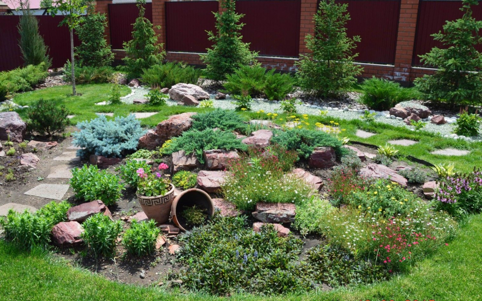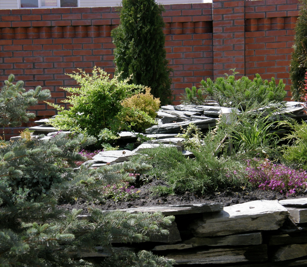 Рокарий у забора с хвойниками