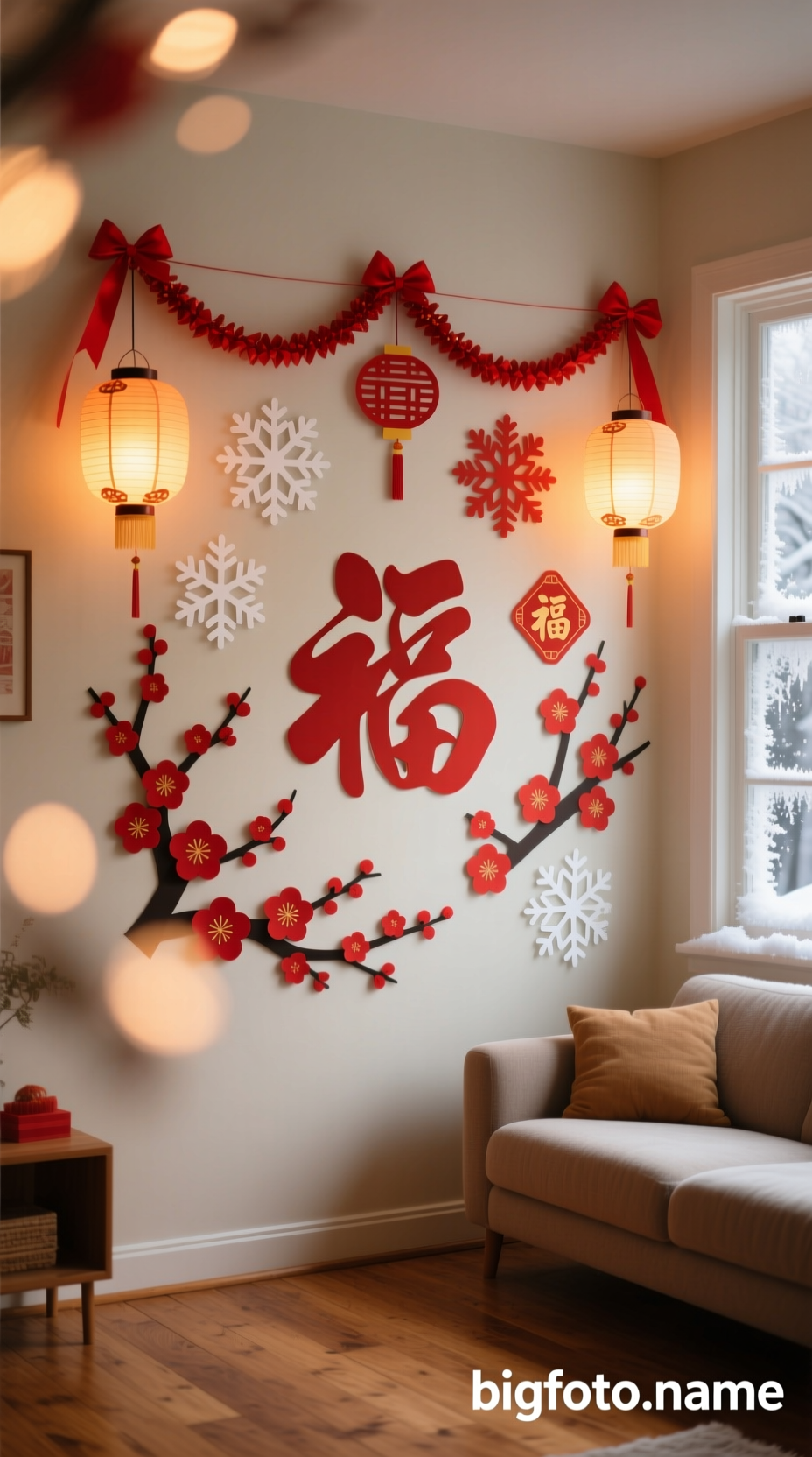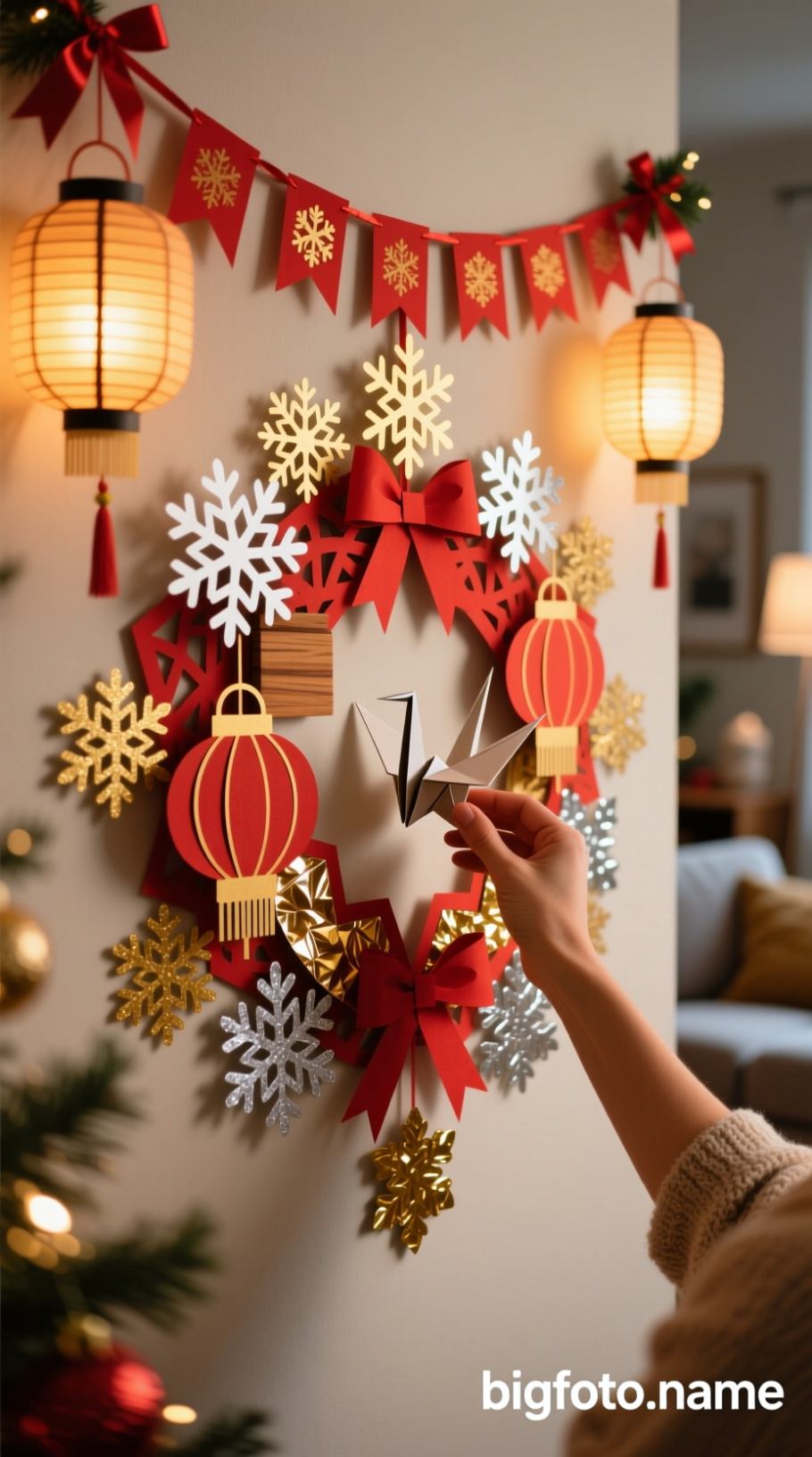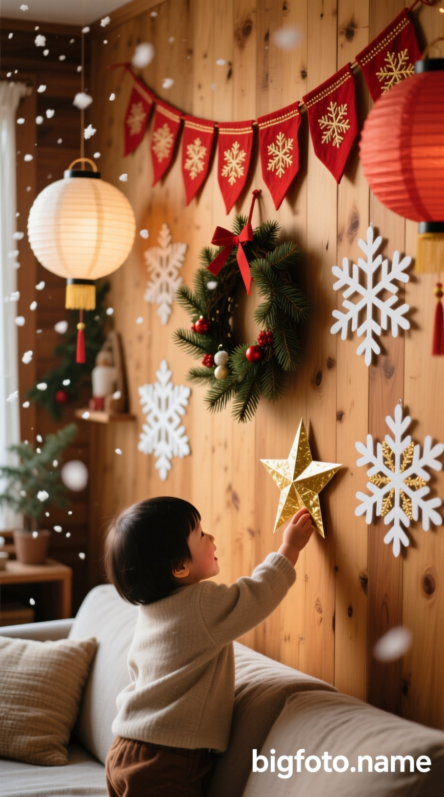 Прекрасным примером может стать композиция из бумажных снежинок, вырезанных вручную. Их можно разместить не хаотично, а в виде плавной волны или симметричного узора, подчеркивающего архитектуру стены. Добавьте легкое мерцание — например, используйте перламутровую бумагу или аккуратно вплетите тонкую гирлянду с теплым светом. Такой декор не требует больших затрат, но создаёт ощущение настоящей зимней сказки и гармонично дополняет любое пространство.