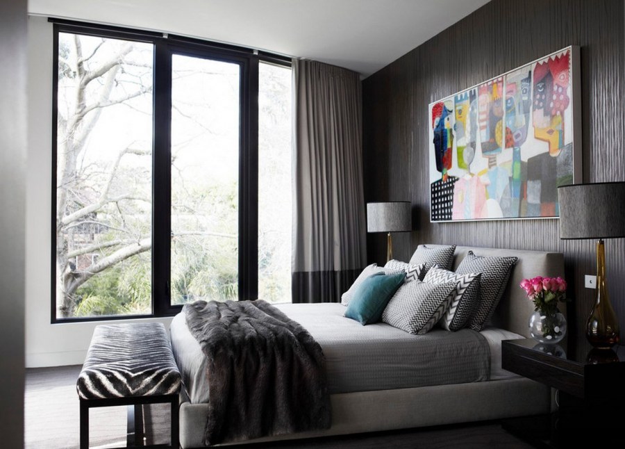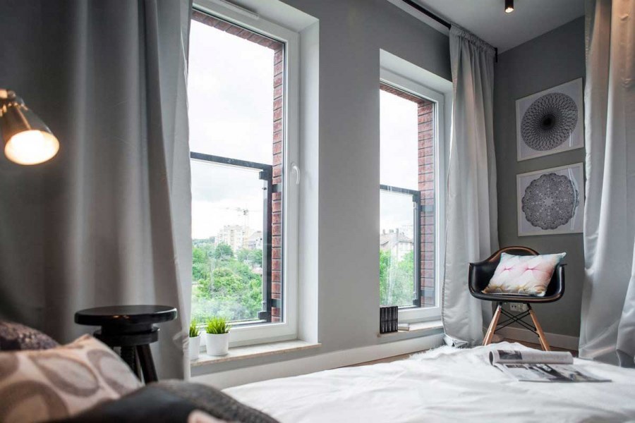 Серые шторы в интерьере спальни