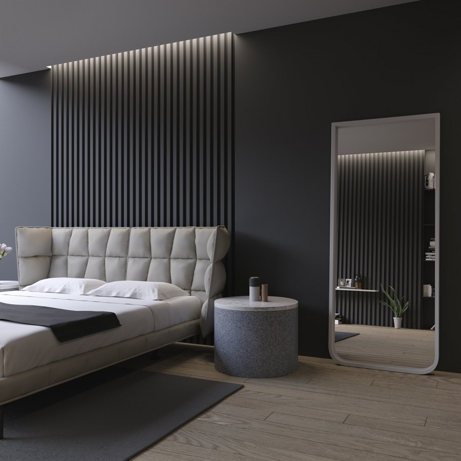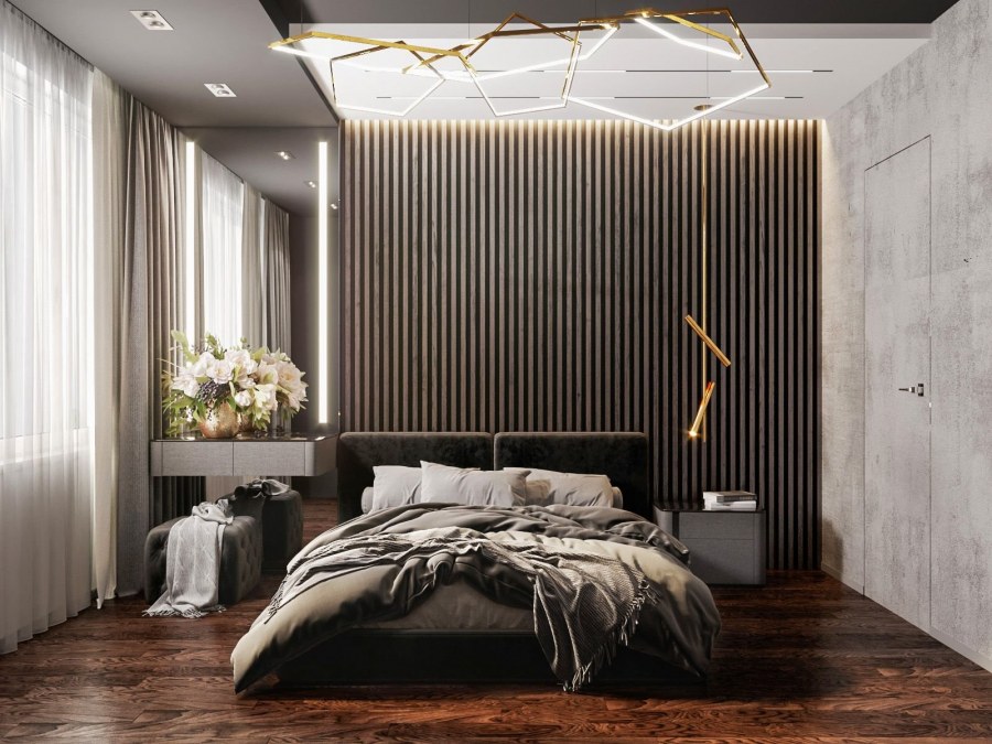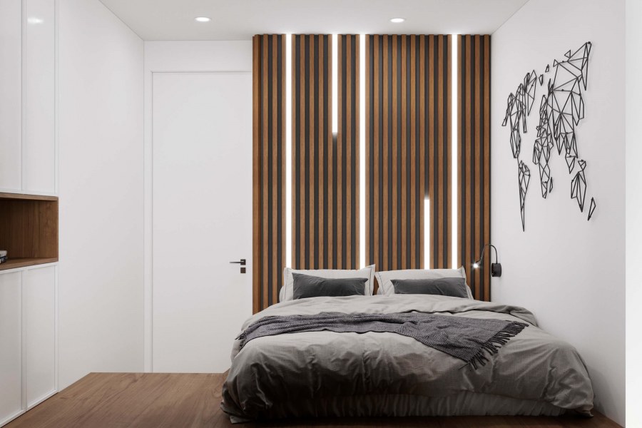Спальня с рейками на стене