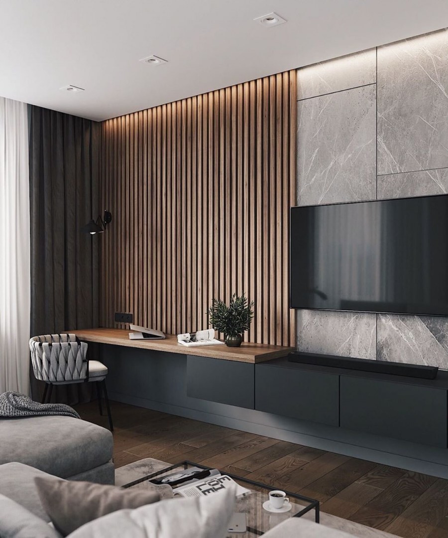 Деревянные рейки в интерьере гостиной