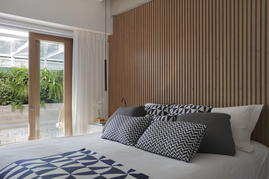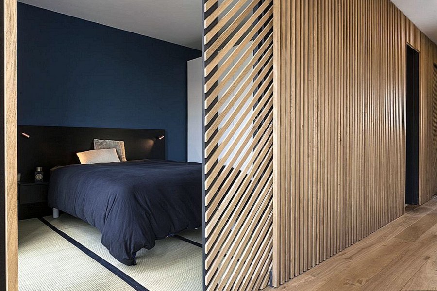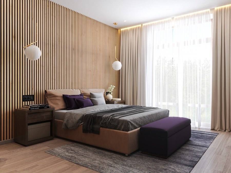 Спальня с деревянными рейками на стене