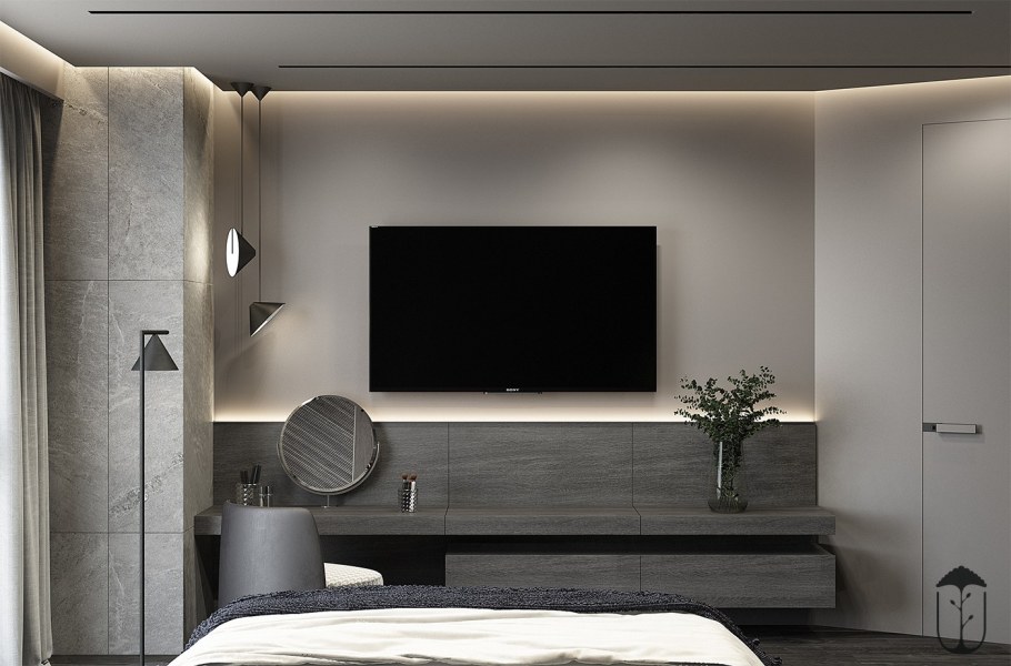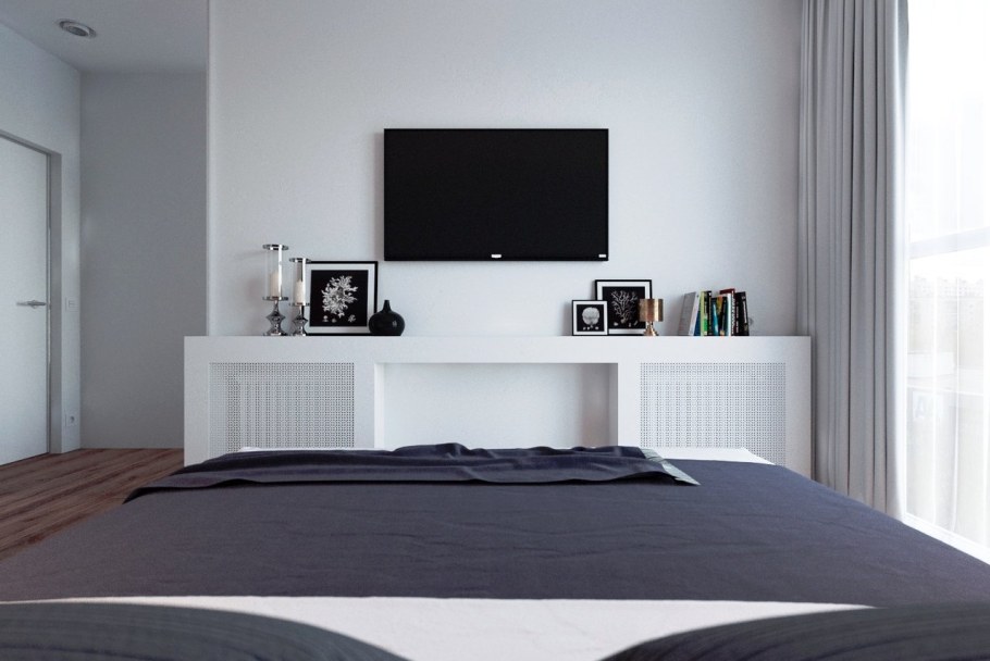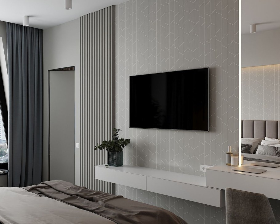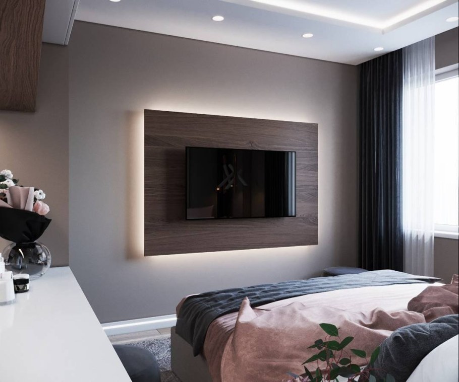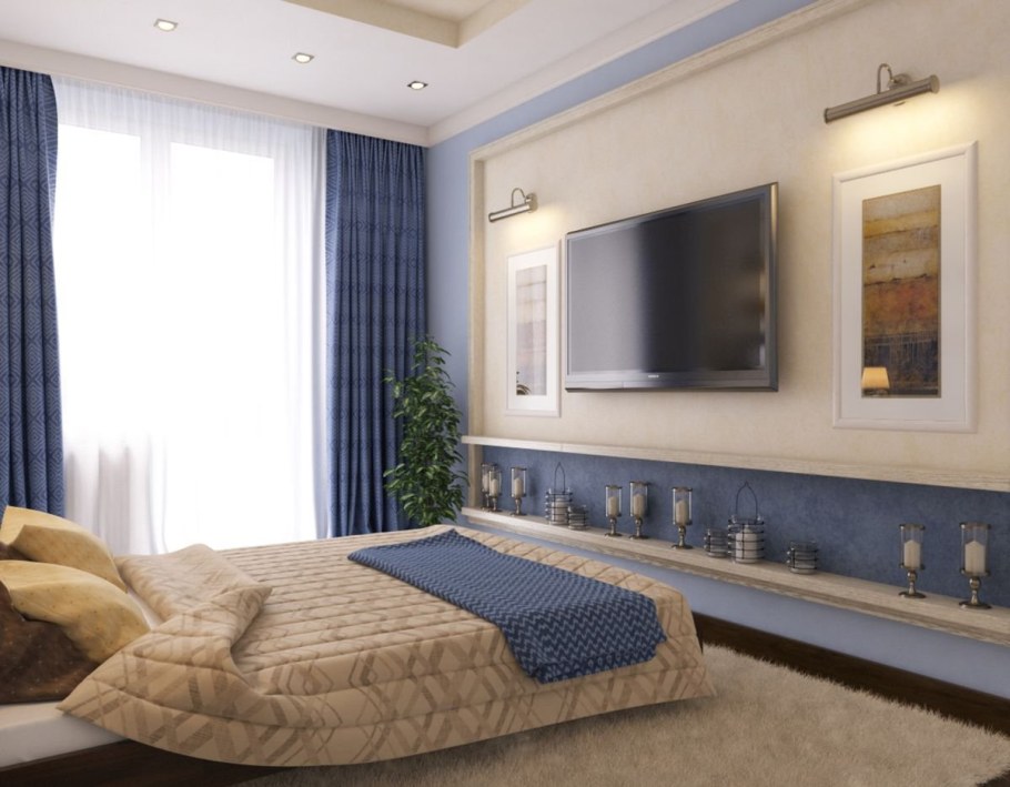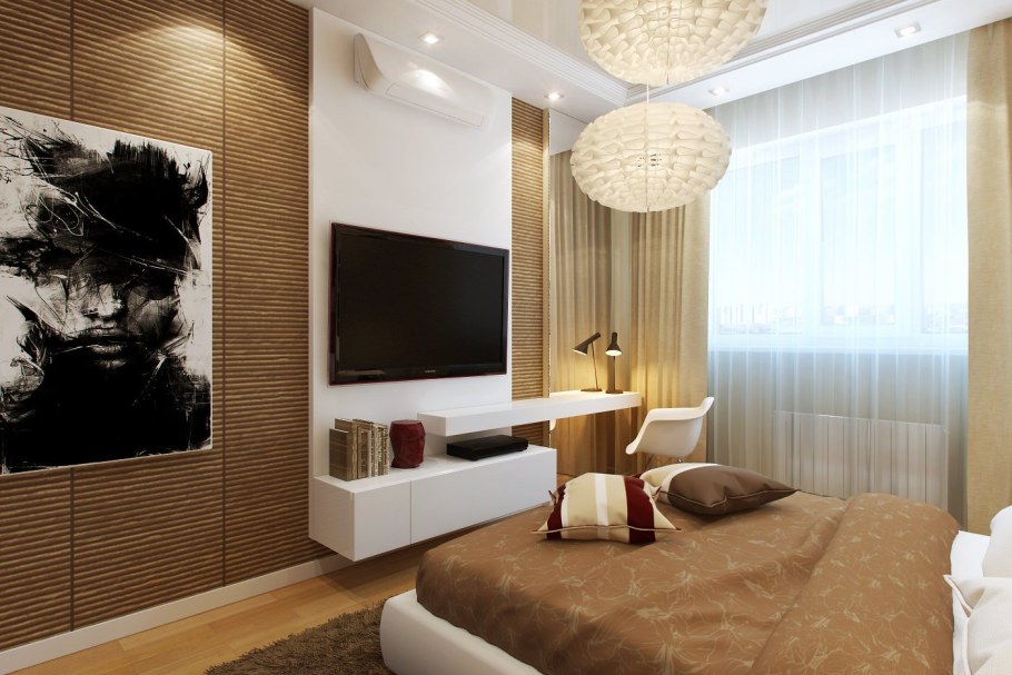 Декор стены в спальне напротив кровати с телевизором (75 фото)