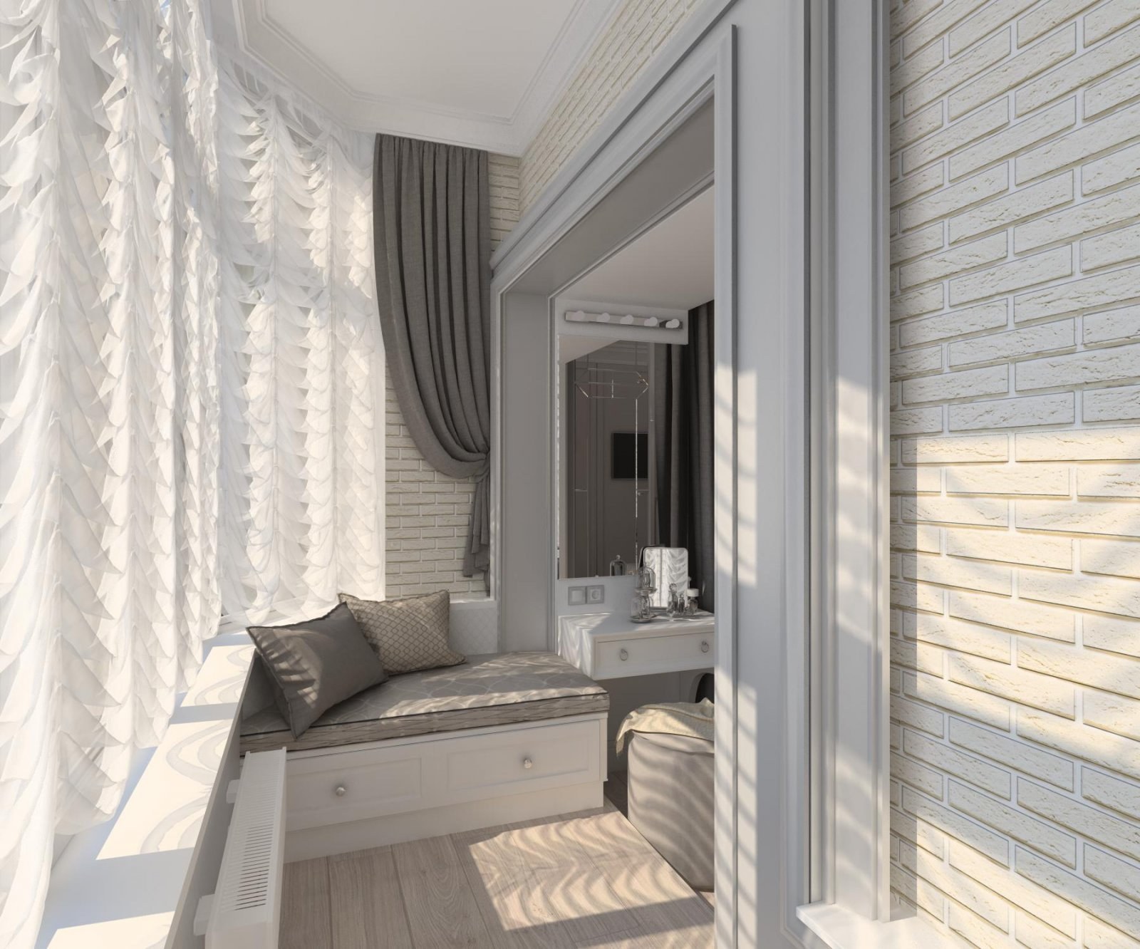 Белый балкон кирпич Объединенный с комнатой