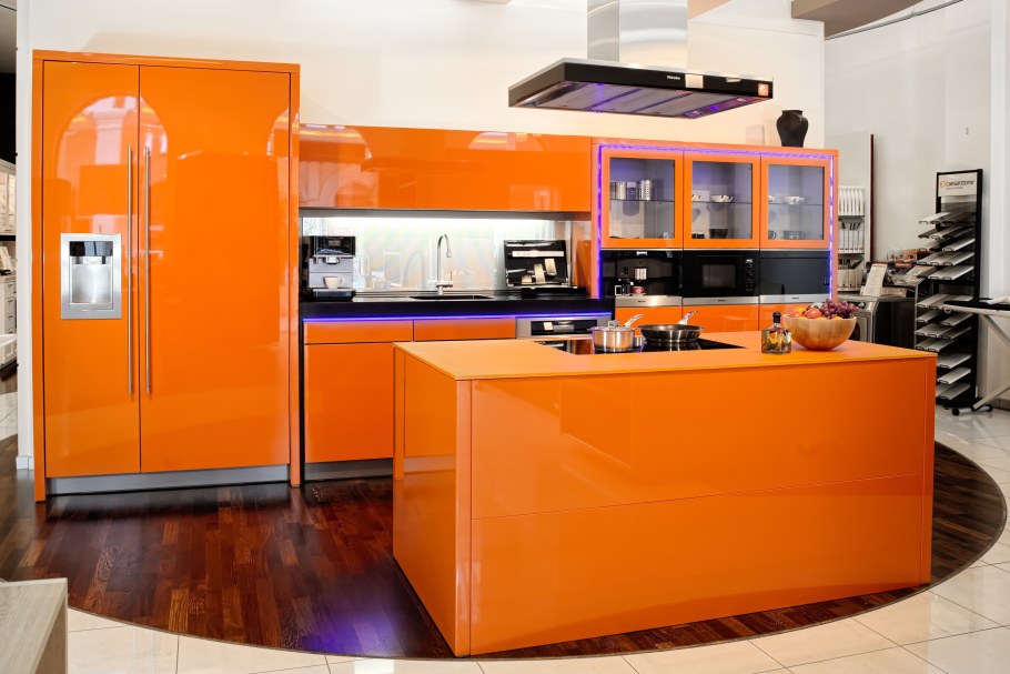 Фотообои в интерьере оранжевой кухни (75 фото)