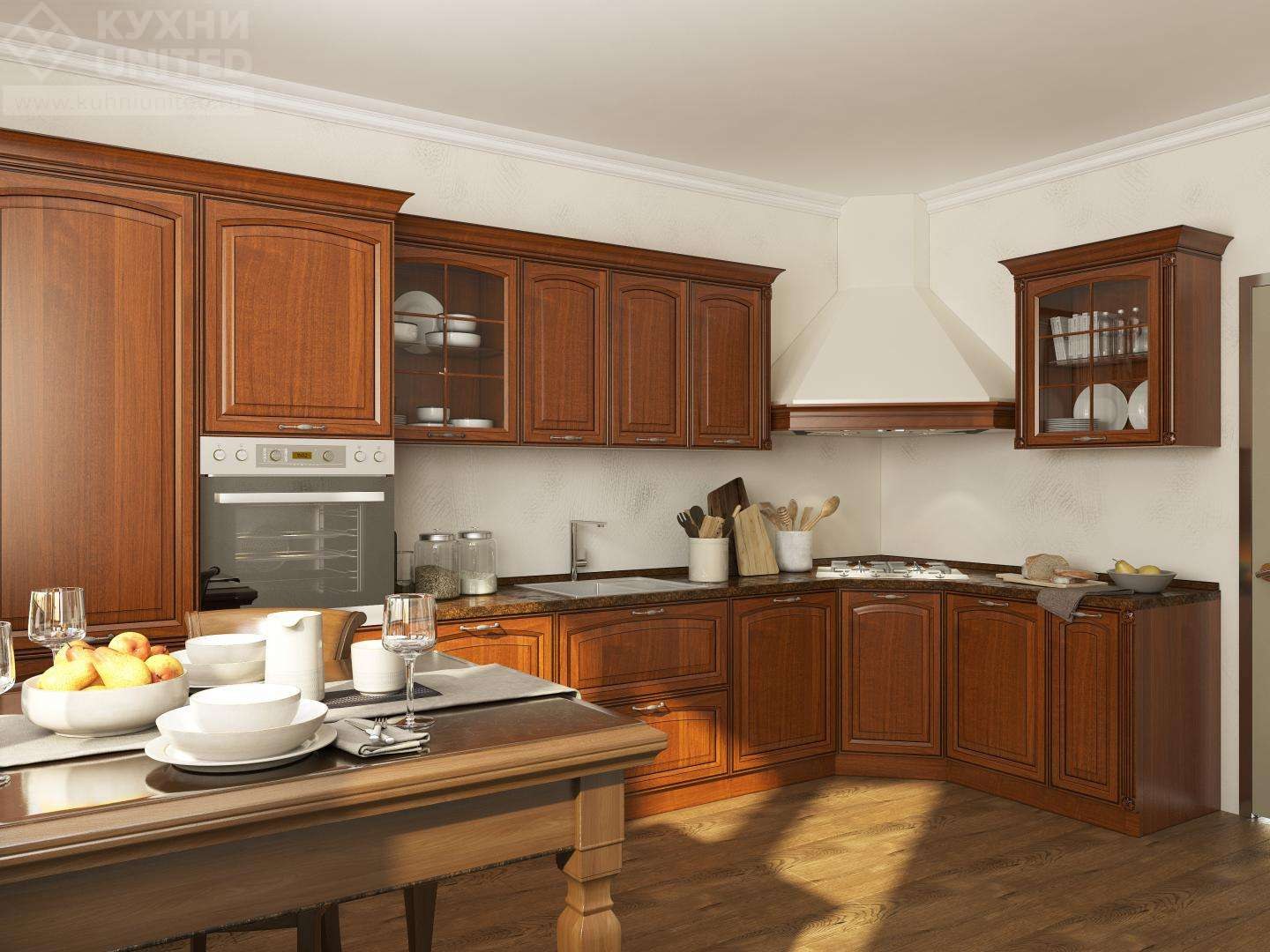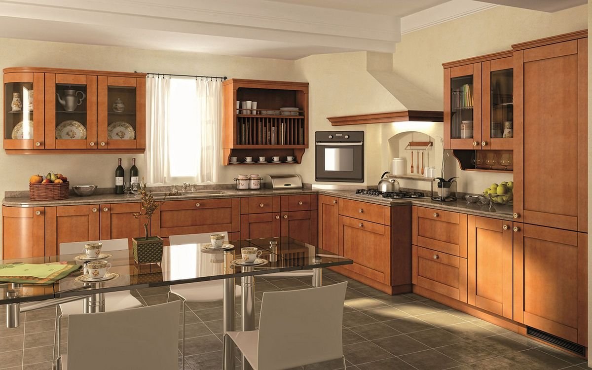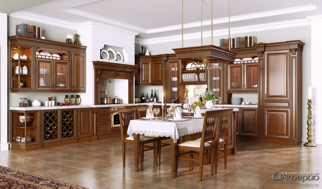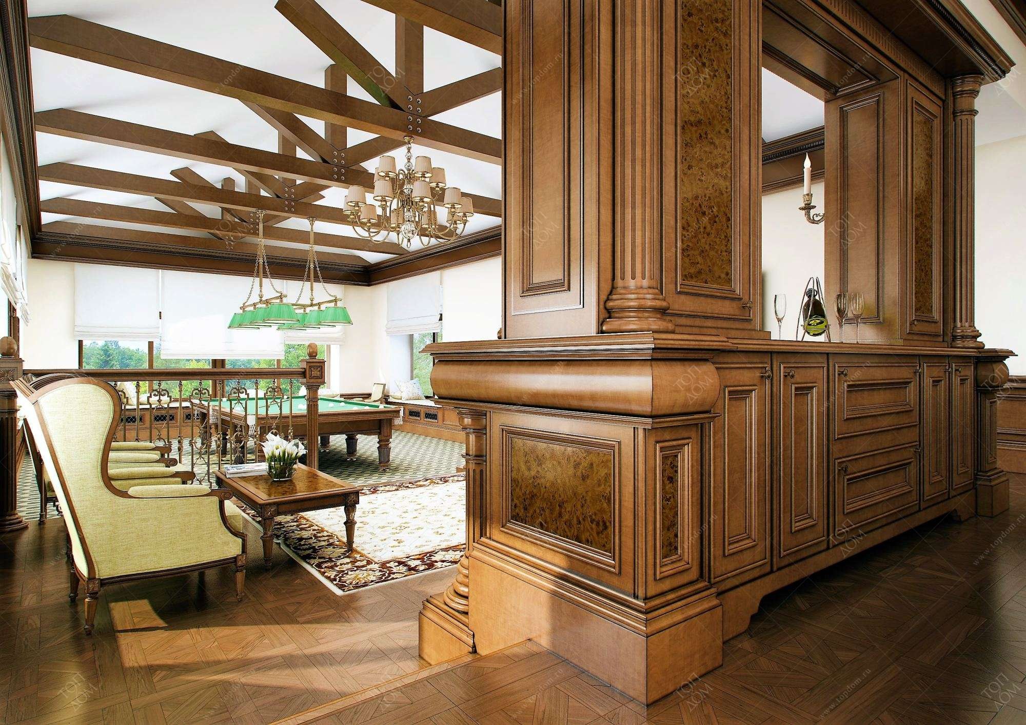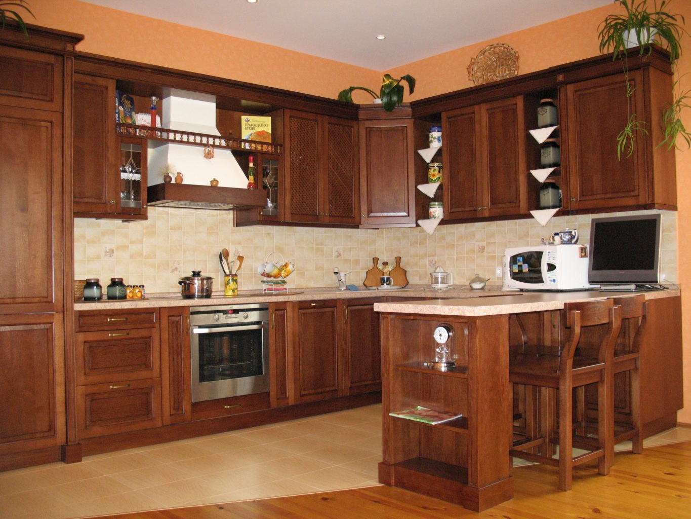 Дизайн кухни классика рыжая под дерево с барной стойкой
