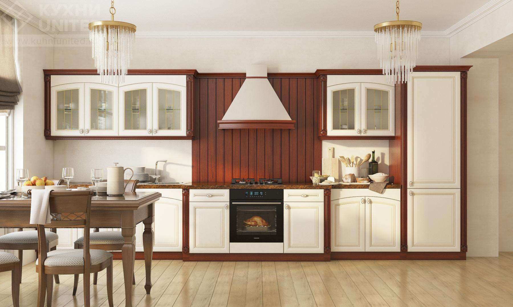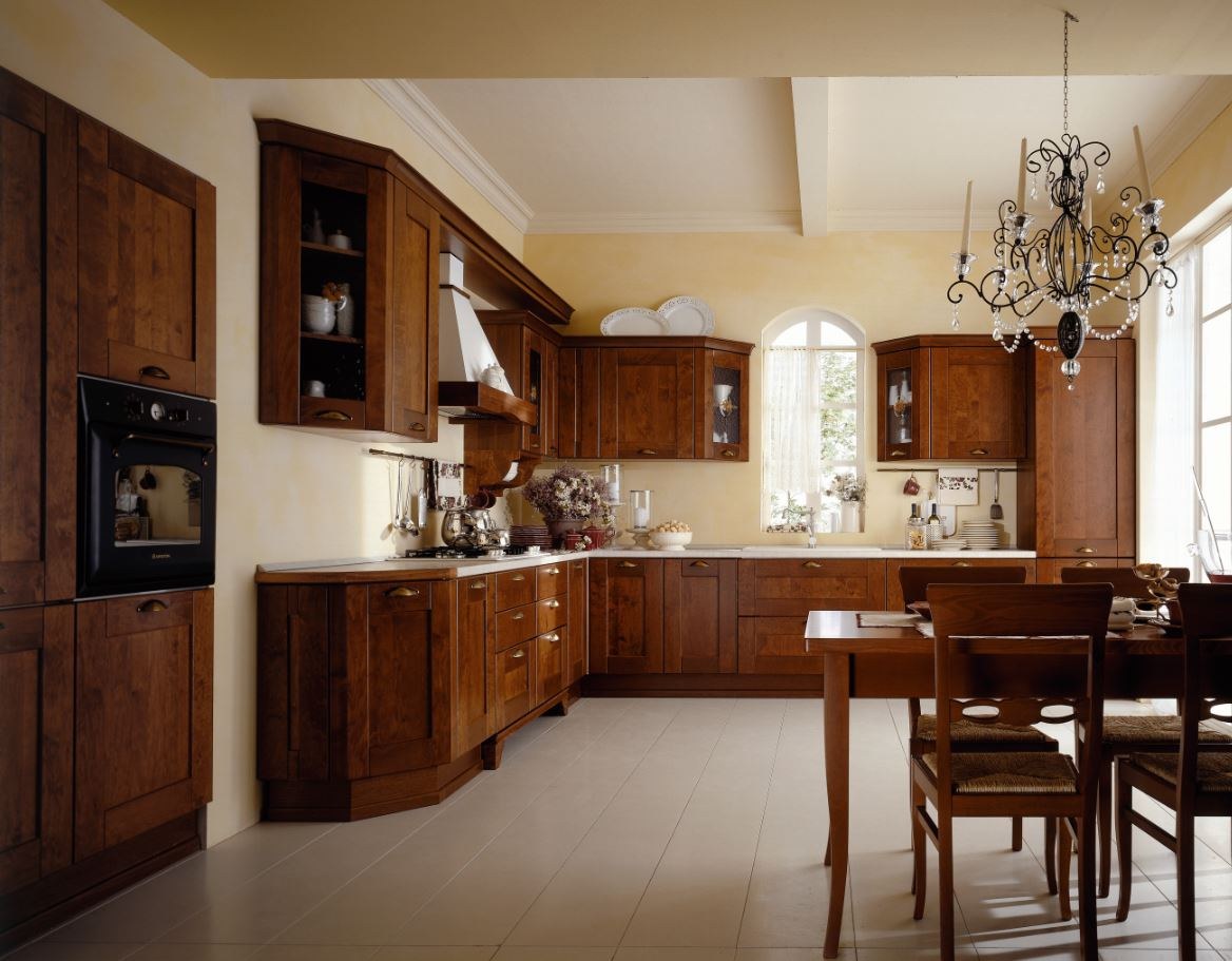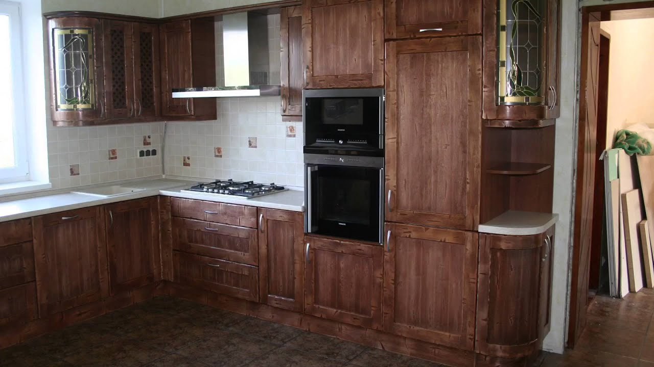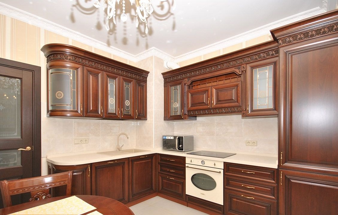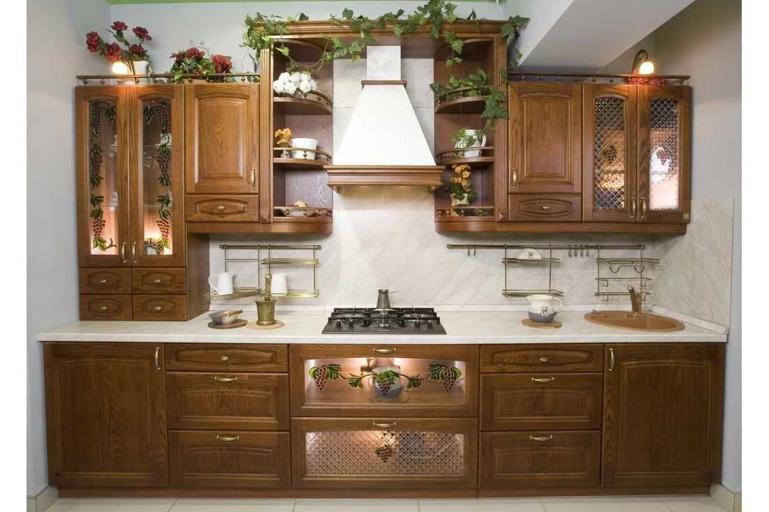Дизайн кухни классика рыжая под дерево с барной стойкой