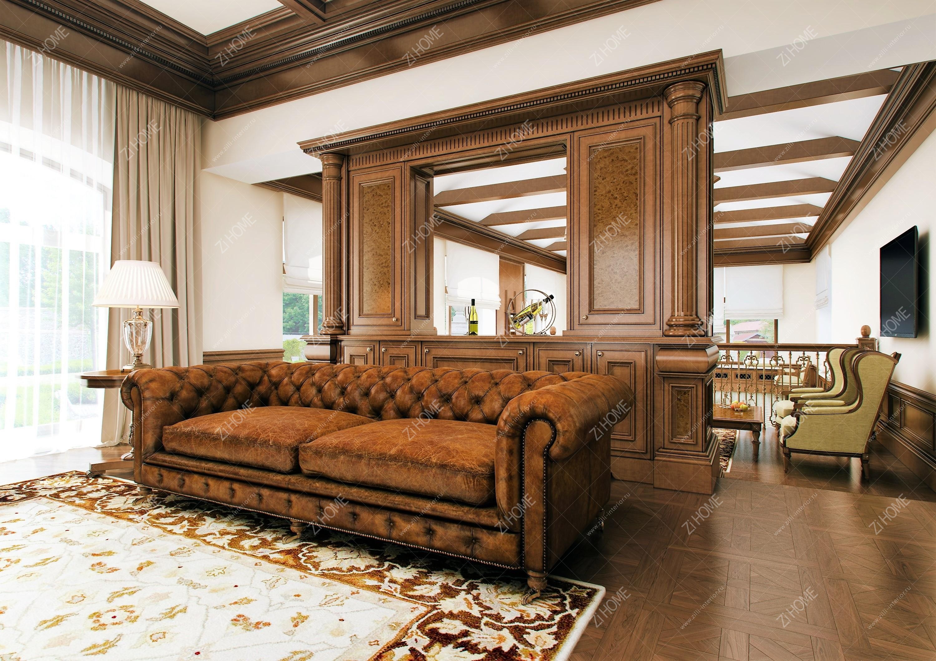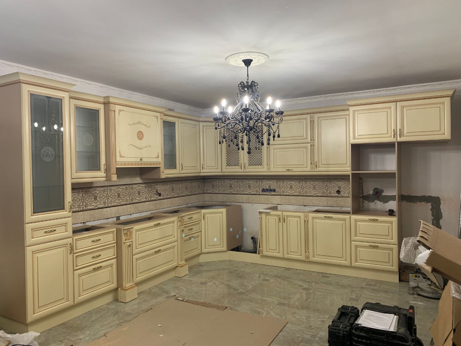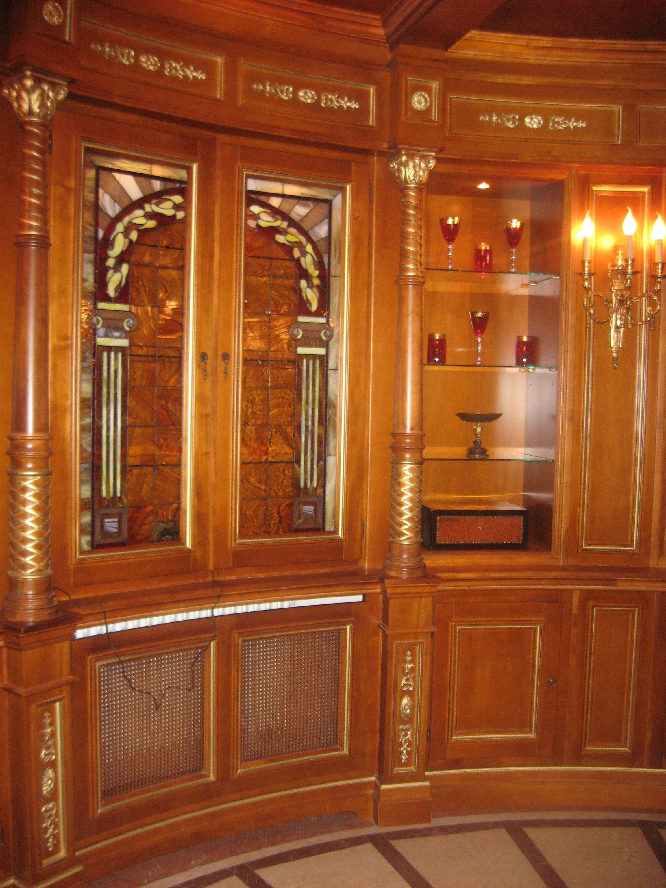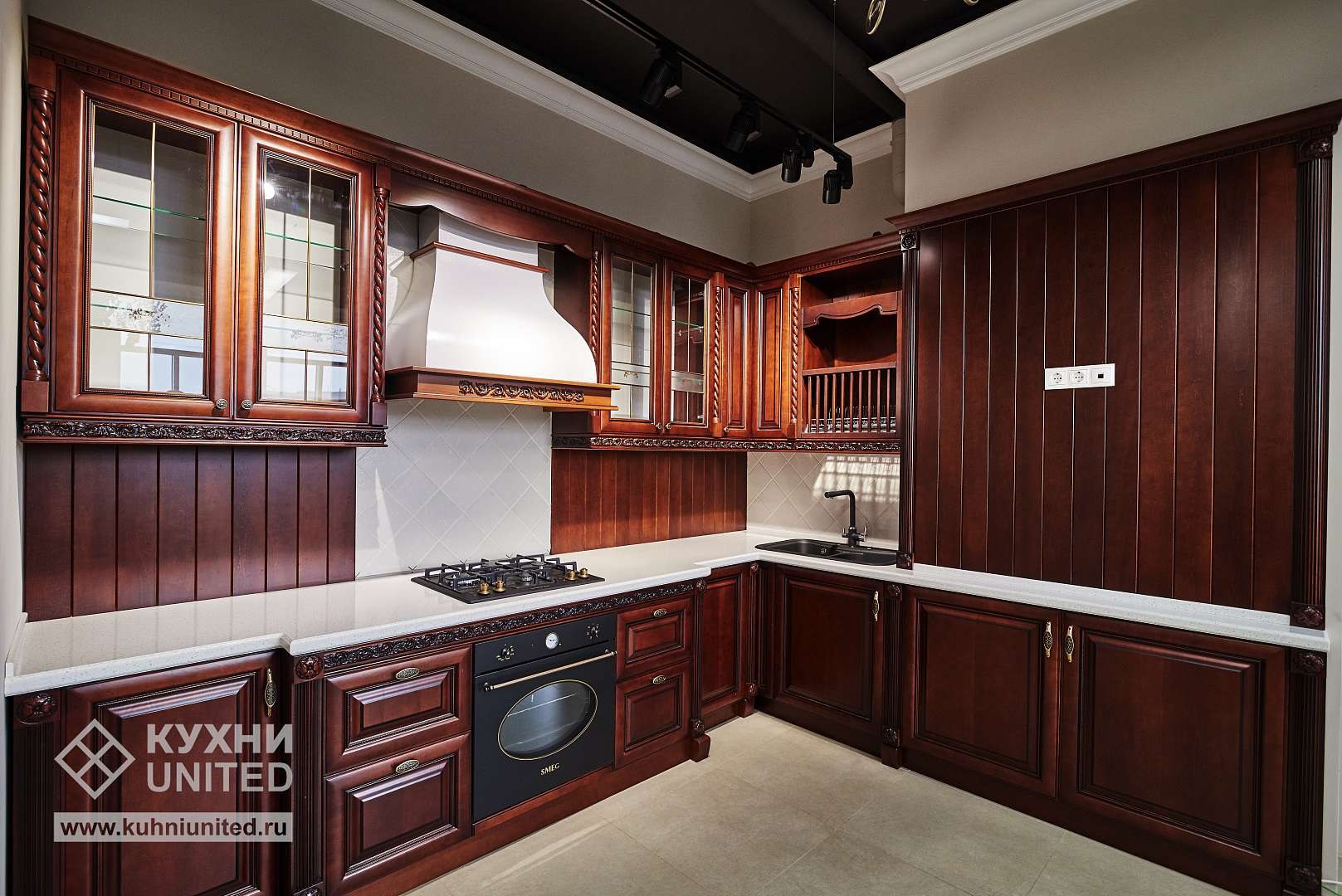 Дизайн кухни классика рыжая под дерево с барной стойкой